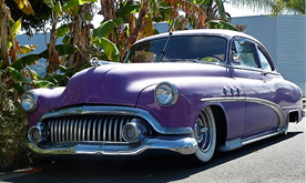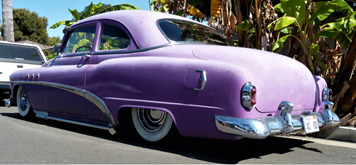 In the same industrial area, there was a Ford Sedan Delivery that had painted the headlight rings, so it looked like it was a "Frenched" in headlight. This purple Buick could have done a similar thing with the purple paint for a custom look. Most things were all low-cost custom jobs that make the 50s style relevant.
