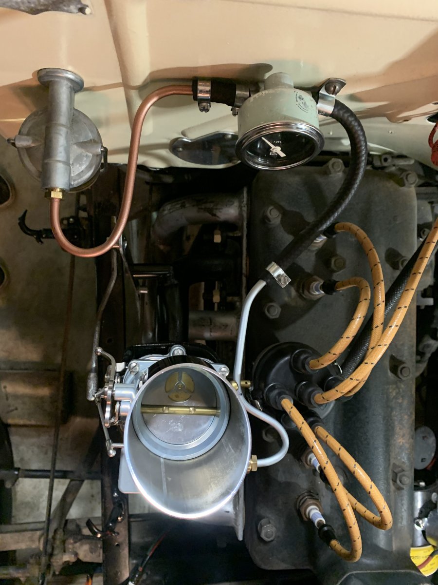 Yesterday was a huge day for the car. It started with a series of fun errands. First, I swung by @SAVAGE's place to catch up, talk strategy and pick up the Stromberg banjo. We considered running an old Eelco elbow fitting, but we concluded that it was the wrong thread size. He had a polished banjo in stock—and even hooked me up with his latest T-shirt of his Fueler (that I am currently wearing). IMG_3765.jpg