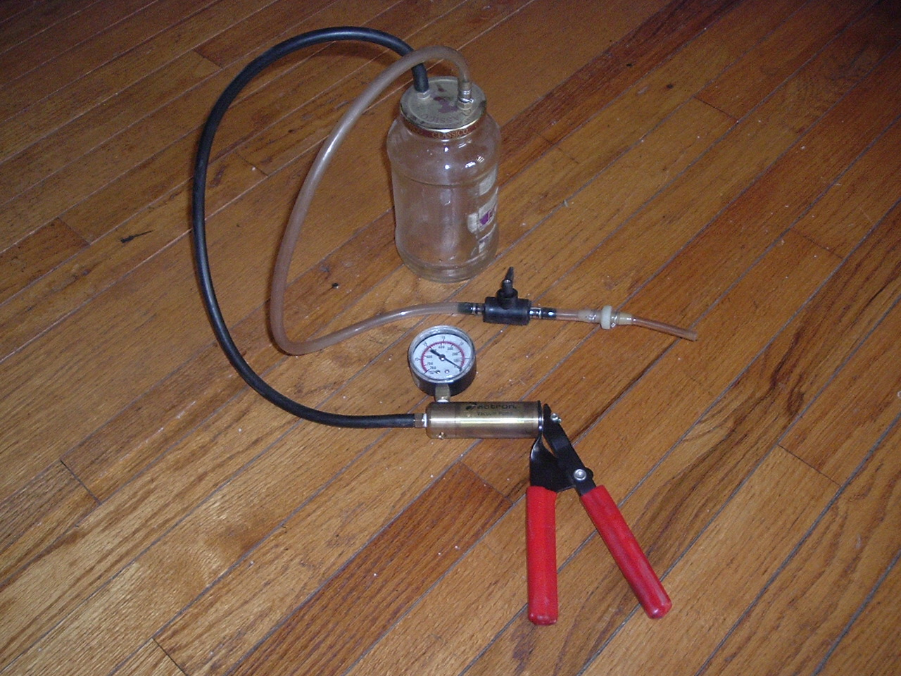 Here's the rig I use. It's an Accutron Vacuum pump that I pump to 15" Hg once the hose is fit to the closed bleeder. I added a shut-off valve and a one-way valve in line because my hand got tired from pumping it up from "0" each bleeder.This way most of the vacuum holds in the jar and I lose very little brake fluid when removing the hose. I use petroleum jelly around the bleeder valve threads to stop air from being sucked in when you open the bleeder. You can suck a large amount of brake fluid into the jar at each valve to insure you get all the air out of that line. Start at the bleeder farthest from the M/C and work closer just like you would during any bleed job.