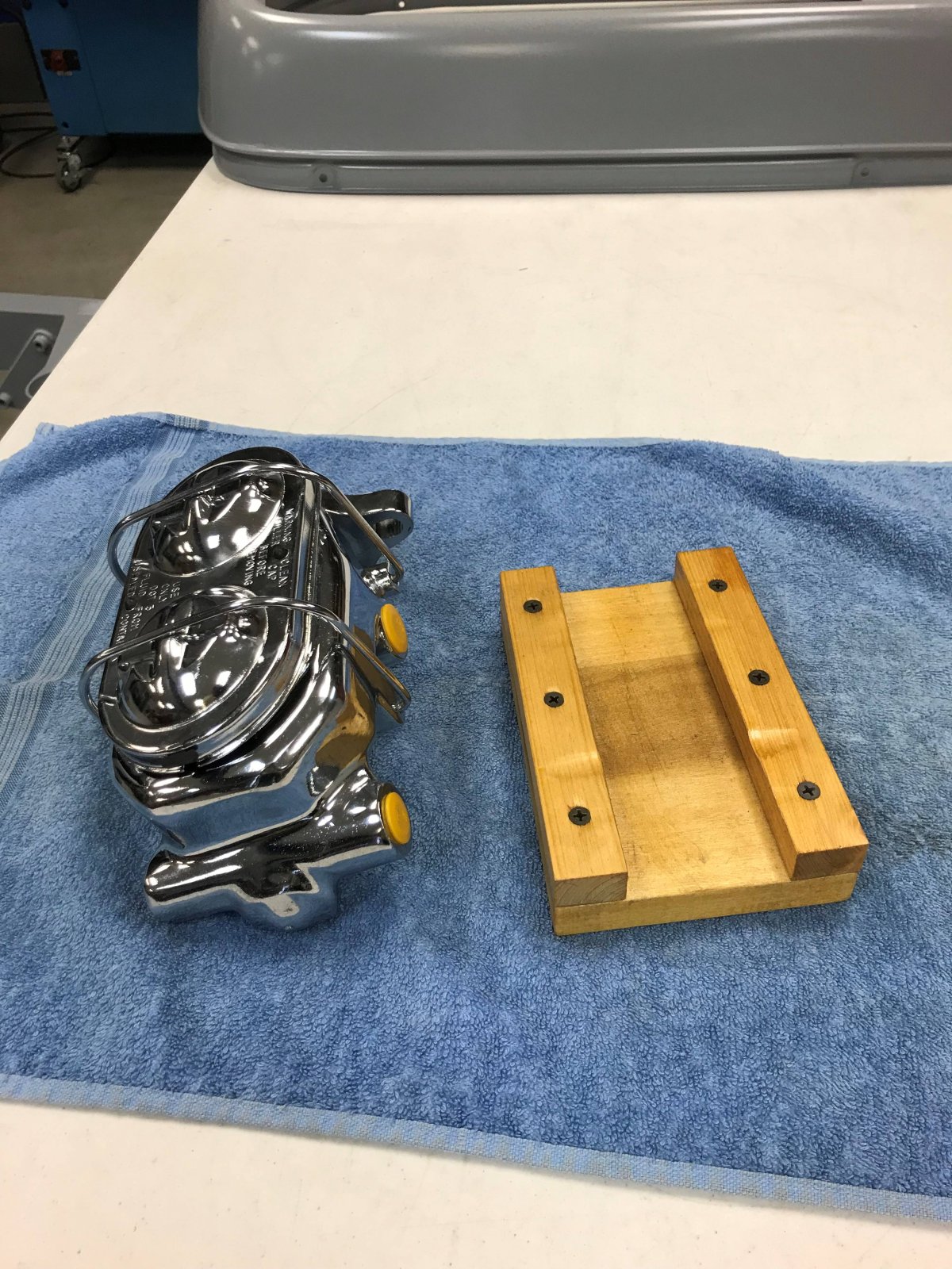 #1 Before I bought this bleeder, I read many reviews that said the hold down chains for the master cylinder lid did not work well to make a good seal. So I came up with a way that always made a good seal on the master cylinder. I made a wooden platform that fits on the bottom of the master cylinder.