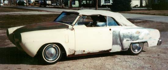 Found a '51 Stude Convert, an old custom, awhile back sitting in the woods. Story is this car was in Studebaker Cafe on display in Louisville , KY years ago. It had been made into a single seat roadster, no side windows and a molded-in trunk 8 feet long clear to front seat. Got a friend, 50 years running together, who lusted for a bullet nose and hadn't found one to suit him yet. We went for a look see and he had doubts. No floor at all, rusted in half frame, bare shell was about it. What the hell, I'll buy it, you build, he said, and $400 later it was in the shop. A 5 gallon bucket of lead melted out left us with no car from dash to back frame crossmember. Had to fab new trunk and back seat area. No parts around close. Necessity is the mother of invention, have to use what I got laying around. Cut 14" out of '68 Riv deck and use back 6" of Riv hood, section back in one piece and we have a rear decklid. Lot of work done and a LOT more to do. So far, '55 Chev frame, '90 Malibu rack, '85 Riv disc brakes, '84 Buick rear axle, '56 Olds Rear springs, '56 Olds dash, '62 Olds convertable top frame, '76 Olds gas tank, '61 Lancer taillites, '90 Dakotal bumper, '58 Chev wheels, Plymouth hubcaps. Chopped windshield 3", channeled body 7", Z'd frame 4", remove 3" of body from vent windows all around greenhouse. Replace most of metal on lower 3" of body, set back new firewall 4". Have 500 Cad and T400 to set in it. Total cost so far, about $1500 with new tires. Labor...lets see, 10 cents and hour times xxxx hours, aw fuck it, you help me on my next car, this is fun. Here are some before and after pics.