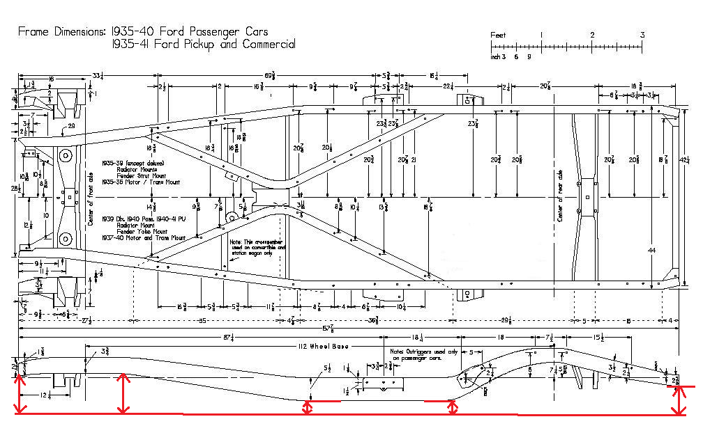 http://www.wescottsauto.com/WebCatalog/Tech/FrameDiagram1935-40.pdf (this is the inaccurate diagram as it displays the front half of the outer frame rails having a part that is straight in the vertical plane. This is incorrect. There is no straight line in the front half of the outer frame rails in the vertical plane)