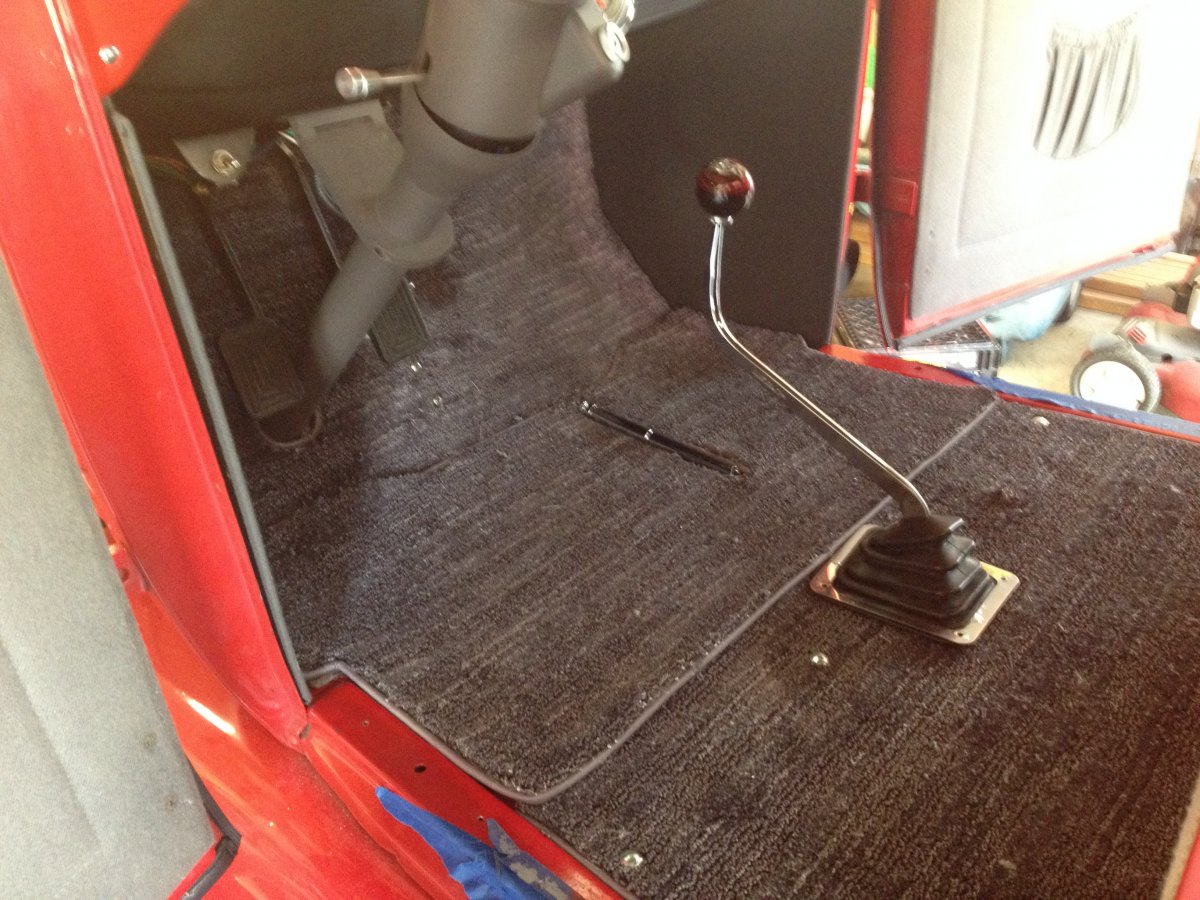 Automotive Carpet in my Model A and my first try at carpet binding. It turned out OK for a first try. I used snaps in the corners so it is removable for cleaning and to dry it out. Originally I had outdoor carpet, but it was pretty crappy and didn't stay in place.