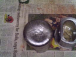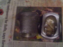 We did another pour today. I lowered the cooking temp on my baked core from 450F to 325F. Bad idea. The core gassed and ruined that pour. Vern has some better pics. After he went home I made another core. Added vent wire holes connecting with the bottom holes I spoke about earlier. Blind holes not quite to the top of the core but open to the bottom. I also set it up off the table so the vents could work freely. I baked this core for 30 minutes at 450F. I let it cool on its own. I warmed the mold with a hand held propane torch well in advance of the pour hoping it would encourage any wetness and gassing to be minumized. I also did not put any sand at the mold joint as we noticed the finish there was not as good as the rest of the piston when I do that. The pour went well. I did not get the core well centered as you can see. Too bad because otherwise it is a good piston. I know i said i was going to make something to do that with but I got exctied and put it on the back burner. It is up front now. I also think my baked core is a bit too high so after pour I took my core box to the saw and shortened it a bit then repainted it. The finish right out of the mold is nothing short of great. I am more than happy with it. We are making progress. It takes 8 muffins for 1 pour. Don