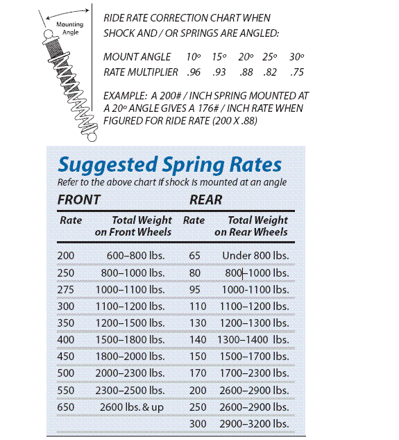 A few questions arise: surely the correction factors should equal the cosine of the angle from vertical? The factors given in the respective tables differ from one another, and both differ from the cosine of the angle in question. I should rather expect: 10° .985 15° .966 20° .940 25° .906 30° .866 Importantly, this applies only where the force to be resisted is vertical, e.g. a conventional axle. If there is a linkage of any sort between the wheels and the springs, e.g. (but not only) any kind of independent suspension, it is necessary to figure out the direction of the force where it acts on the spring, and measure the installation angle from that angle. (The .pdf file shows a set-up featuring triangulated 4-links and a Watts linkage, which should generate a conflict of rotations, even though the angled links' angle is insufficient to provide adequate lateral location on their own. Would parallel links not be better here?)