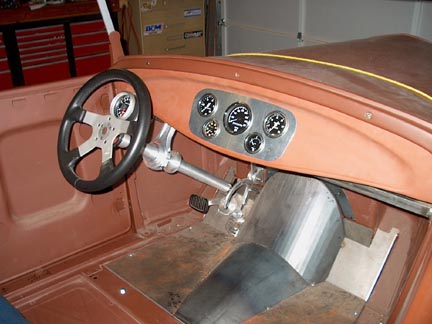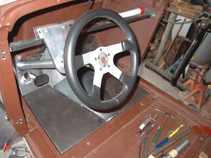 Here's a shot of the finished product. The throttle pedal you see is also home-made, Teflon and UHMW bushed etc. The instrument panel is natural finish aluminum. It may get a brushed or machine turned finish later. The 1" square cross bar - for hanging the steering column - you see under the dash gets powdered black. Once that's done it pretty much disappears from sight.