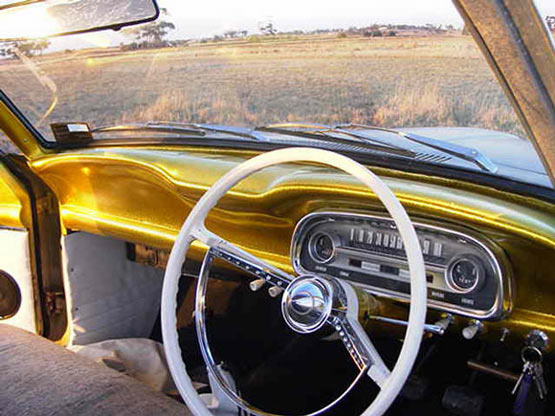 Copper Sunburst Metallic, found on the late model Cadillac CTS. It's beautiful! Looks very sixties to me, too. Also, there's a funky green-gold like on that Model T above that is available on the PT Cruiser- if you can live with that sort of indignity.