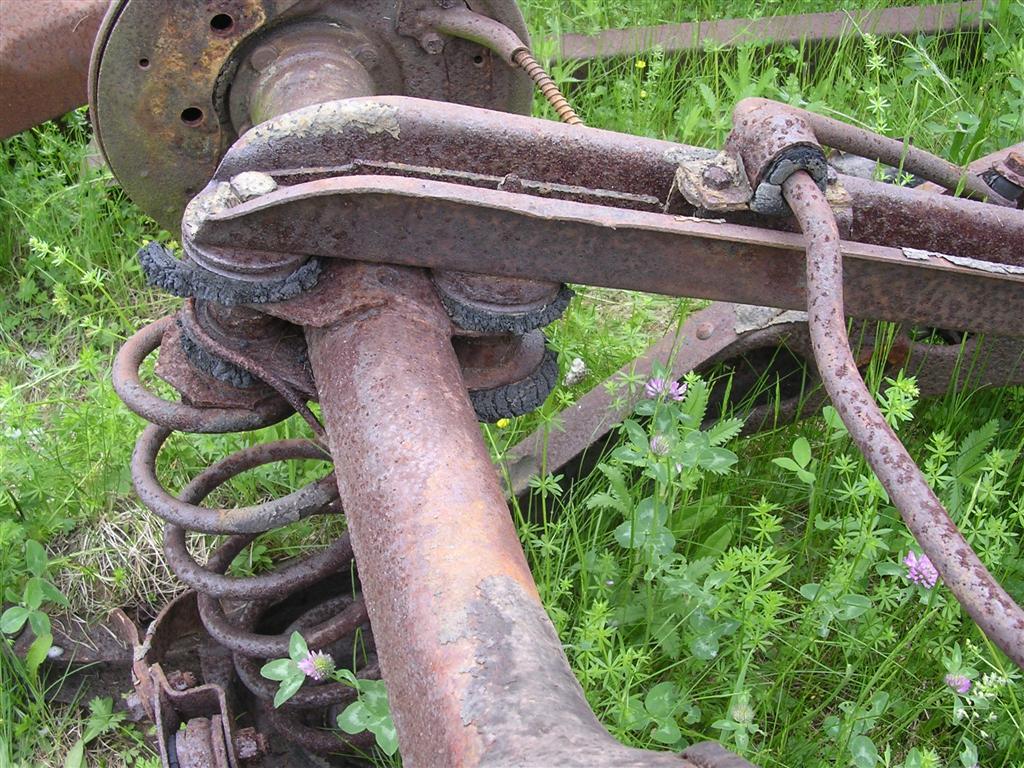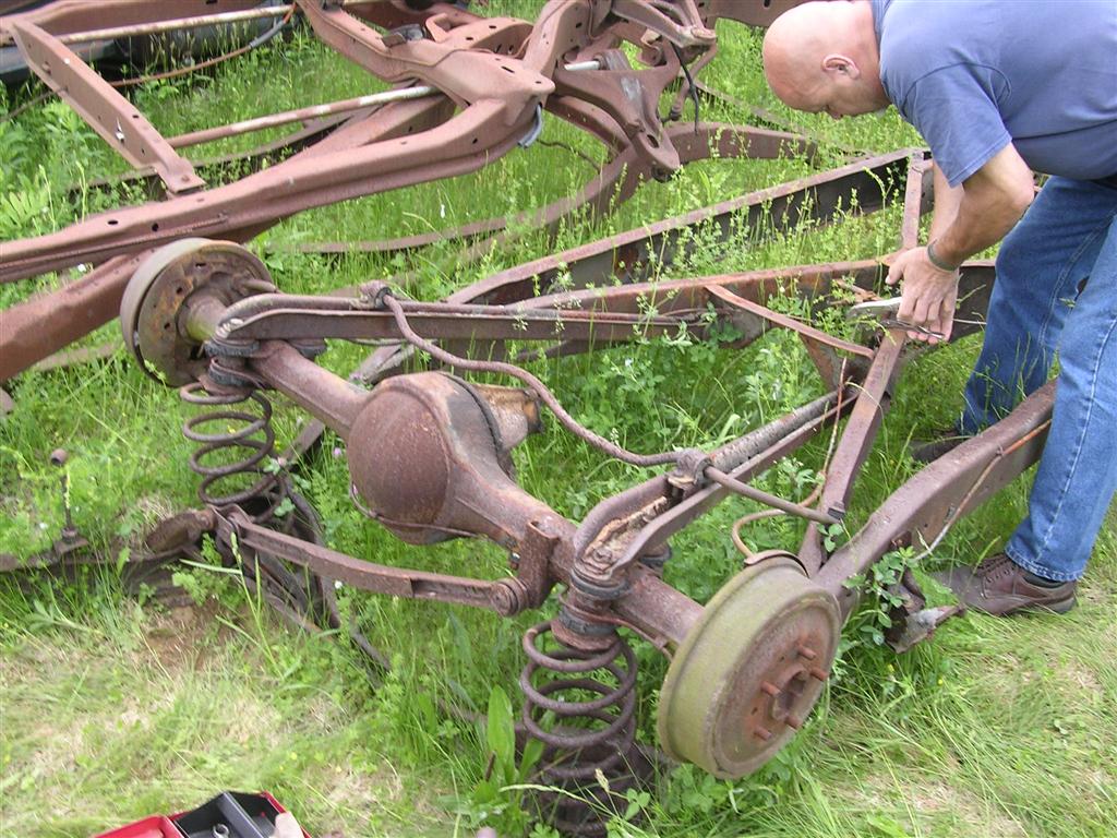 Hey Dave, we went to look for Olds ebrake parts today for your coupe. The owner showed us the 49 Chassis, but when we got the drums off, the shoes and the flat crossbars are missing. But we scored the 2 ebrake levers that hook to the cables and anchor on the shoes. I guess that's a good start. Maybe you can get those 2 flat crossbars from auto parts store, in the "help" brand? or get some from any 11" brake setup? Must be close enough? Broke my camera so I can't put up a pic of the 2 levers we got for you. The ebrake cables were junk, but you can get NOS ones from Pease, I paid $25 each for mine there last year. Check out the stock suspension and bar mounts. Sure beats welding the trailing arms to the axle tubes. You need any of this stuff to set up the coupe? The bars are not rotted, the front cross piece to mount the arms looks good, too. Found a very souped up 371 there too, I might be getting soon. Pop-ups, solid cam, McGurk adj rockers, Stick flywheel and clutch.