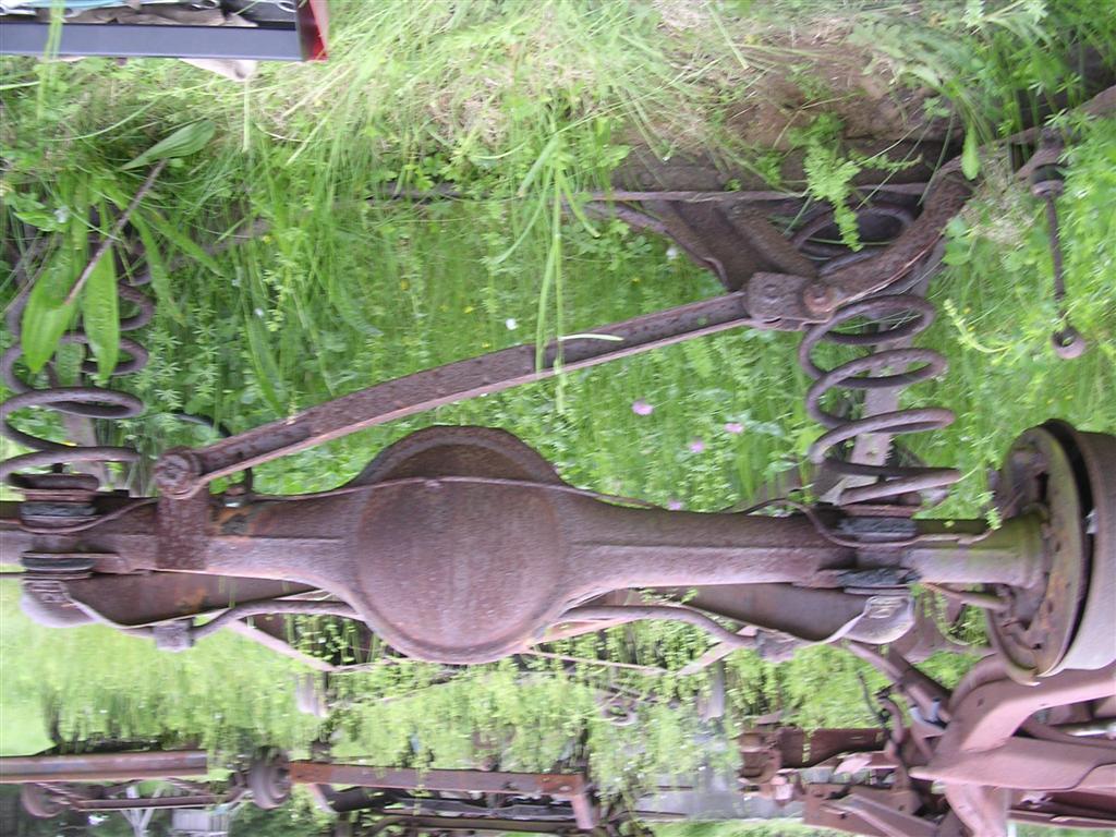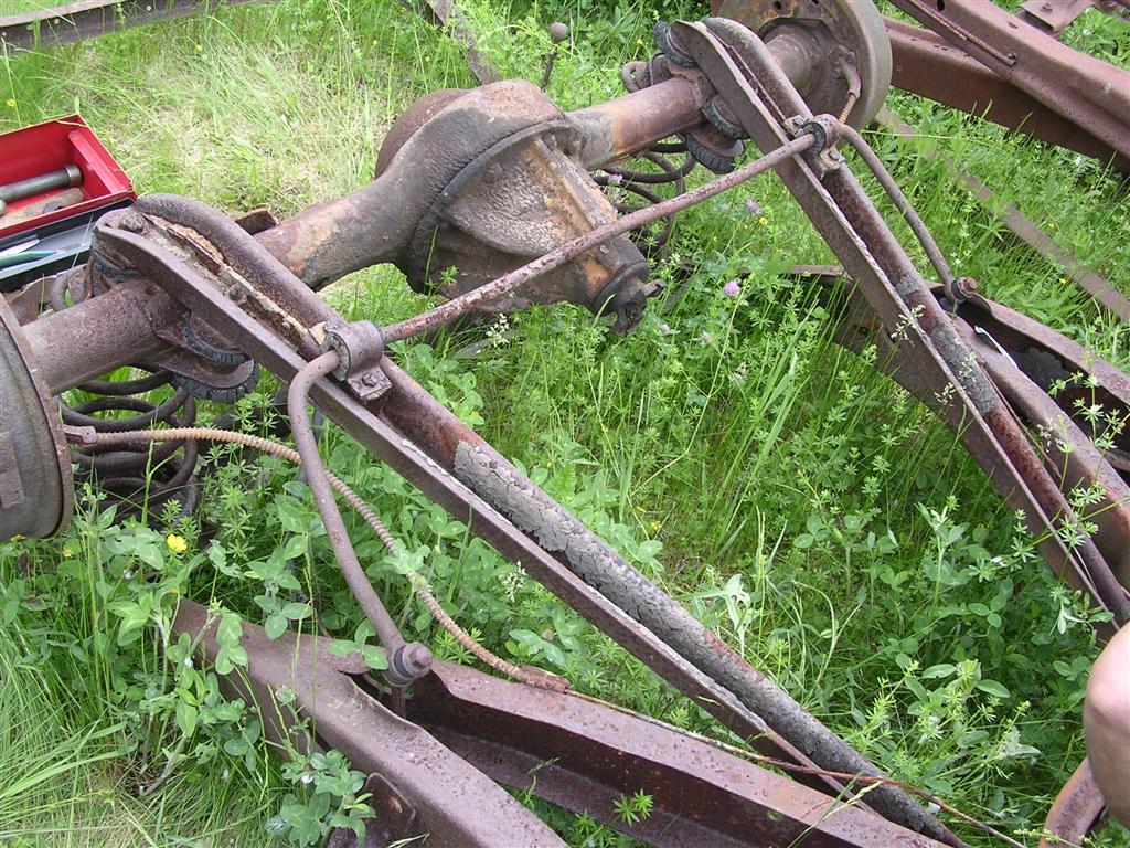Dave, From what I can see of the spring hangers; the eye of the hanger is mounted a lot higher than any aftermarket hanger you can buy. They mounted those high like that, and lowered the spring mount at the 32 crossmember, because it's channeled, but still runs stock fenders. So, your new hanger needs to be an upside-down J, welded to the top of the axle tube. Then the eye will "hang down", so the shackle or spring eye won't hit anymore. It needs to be made from thicker plates, including the side gusset that is used with these plate style hangers. It need to be thicker than repro hangers, because of the odd shape it needs. I should be getting a working camera in a day or so, and I can make a sample from cardboard if you want. Your spring needs to end up a little stiffer than mine, so that the tires don't hit the fender lips on huge bumps. You do have pretty good clearance, so you can loosen your spring rate up to "medium stiff" IMO Also, in this pic, the viewers can see how the trailing arms are mounted parallel, instead of pointing inwards at the front, like they should have been. That's why the welds keep failing.