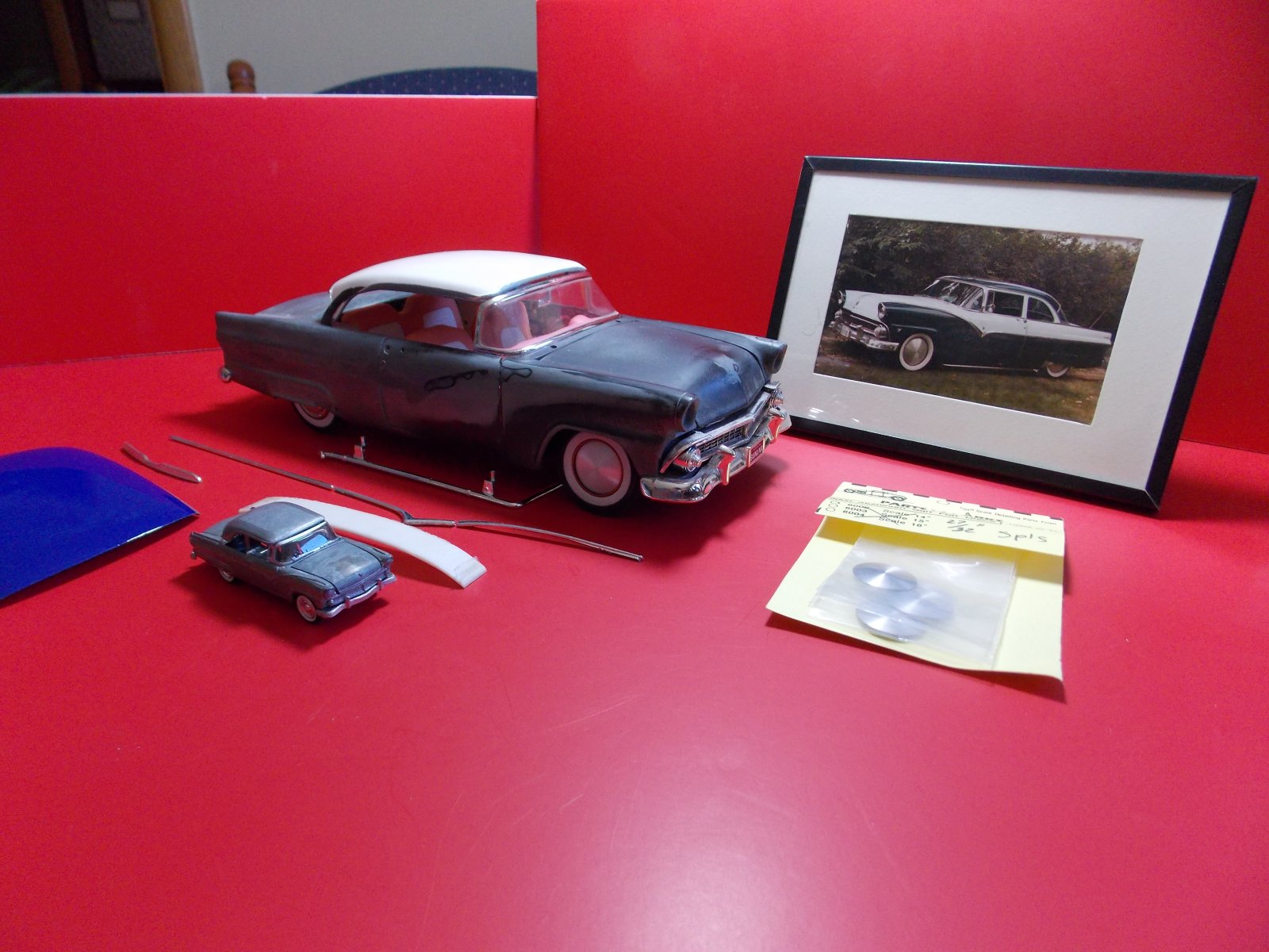Lovin' the '32 coupe. What scale? Did you modify it or did it come this way? Here'e my Tuesday submission. Another unfinished project(s). I drove a '55 Ford Club Sedan in high school. I wanted to replicate it in scale(s). In 1/18th, I chose the Ertl '56 Ford Convertible. I like the casting a lot better than the Glasstop '55 Crown Victoria w/Continental kit from Road Tough (I think). I shaved all the '56 specific trim off the Ertl and filled holes with J-B Weld. I robbed the '55 specific stuff off the glasstop CV. I think the lakepipes came from an Ertl '49 Merc.