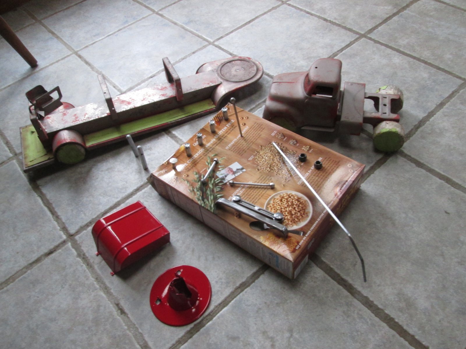 While working on a more involved rollback truck build, I saw another opportunity in my box of spare parts. This Liberty diecast 37 Chevy truck along with a Remco car hauler trailer that I cut down and modified to hold matching wheels, has now become a 5th wheel hauler. I removed the lettering and modified the pickup box, added a trimmed down 5th wheel assembly from a parts truck making a good fit for the modified trailer. This one will be a keeper and can nicely display 1/32 or 1/43 size cars.