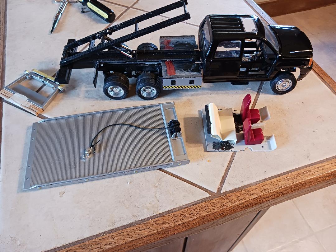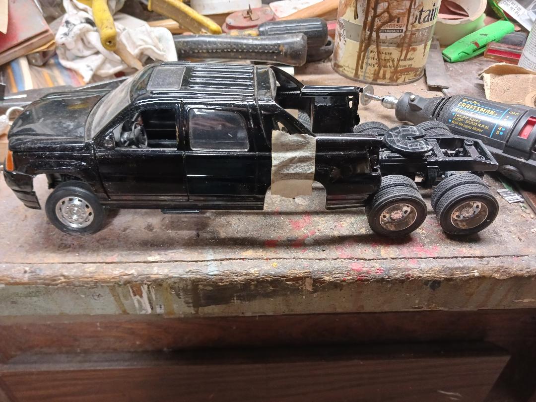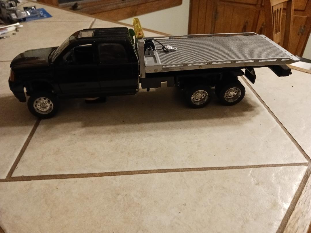 Still working on a late model diecast rollback I am making out of spare parts. I had a semi truck cab and chassis that was missing the front section. I also had a late model GM truck body only. Turns out the body fit on the chassis and even cleared the diesel engine. I cut the cab, made a metal back, built an interior from more spare parts and mounted it to the chassis. A friend gave me a broken Mobil rollback truck bed that I was able to JB weld to my truck chassis. Modified a few more pieces to fit my design and now have a nice custom 4 door rollback truck. Still want to come up with idea for making some kind of running boards for it. Made up too much JB weld one night and ended up attaching a 39 Chevy front clip left over from another custom to the leftover cab of the semi truck. I keep looking at it and trying to think what I might be able to make with it or maybe just haul it around on the bed of the rollback.