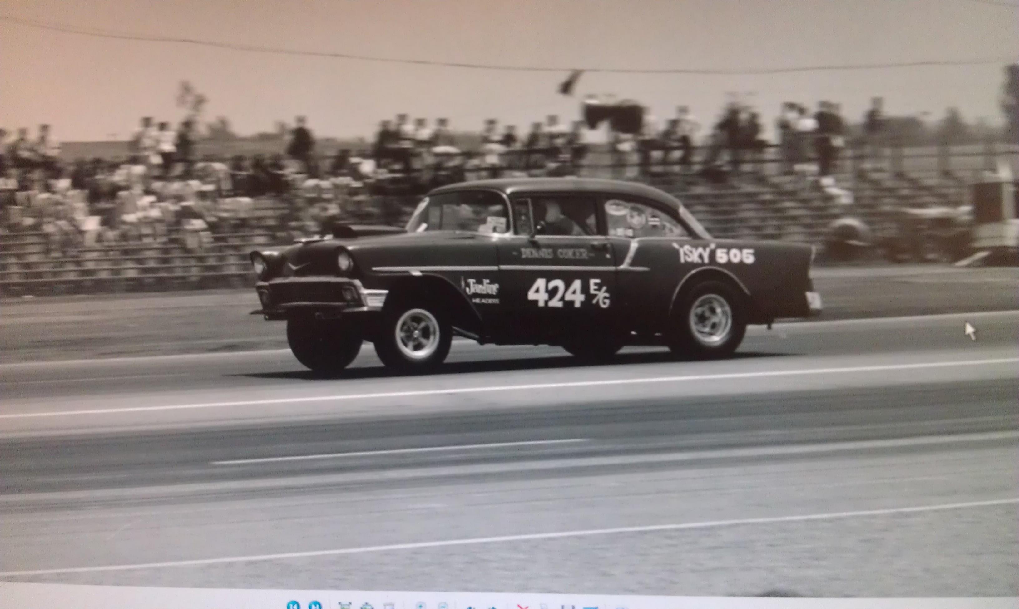 17. Here's Dennis at the '61 Winternationals, I had thought this pic was from '62, but I met a guy at Mooneyes name Phil Smith who took a pic of the '56 at the '62 Winters, it was already painted red with radiused wheel wells, but no hood scoop, so this old black and white has to be from '61. At the '63 Winters, Dennis went to the semi finals in little eliminator and broke the the distributor rotor leaving the starting line. If he had won, he would have had a '61 '62 '63 '64 sweep. denniscocker.jpg