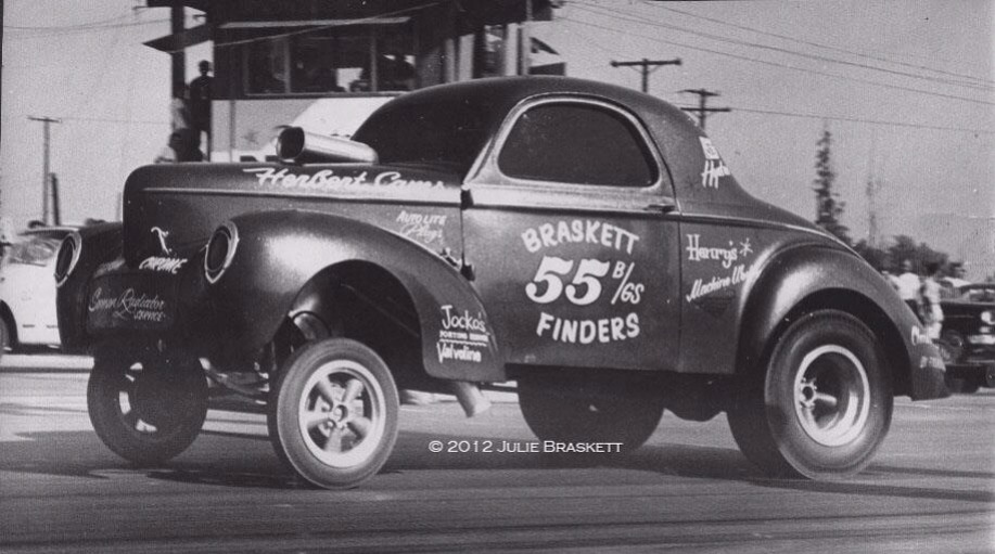Braskett & Finders, maybe at Fontana? Chuck Finders was the master gasser constructor and Braskett would later partner with Gary Burgin in a funny car. Notice Henry's Machine Shop, which did drive train work, pretty good work.