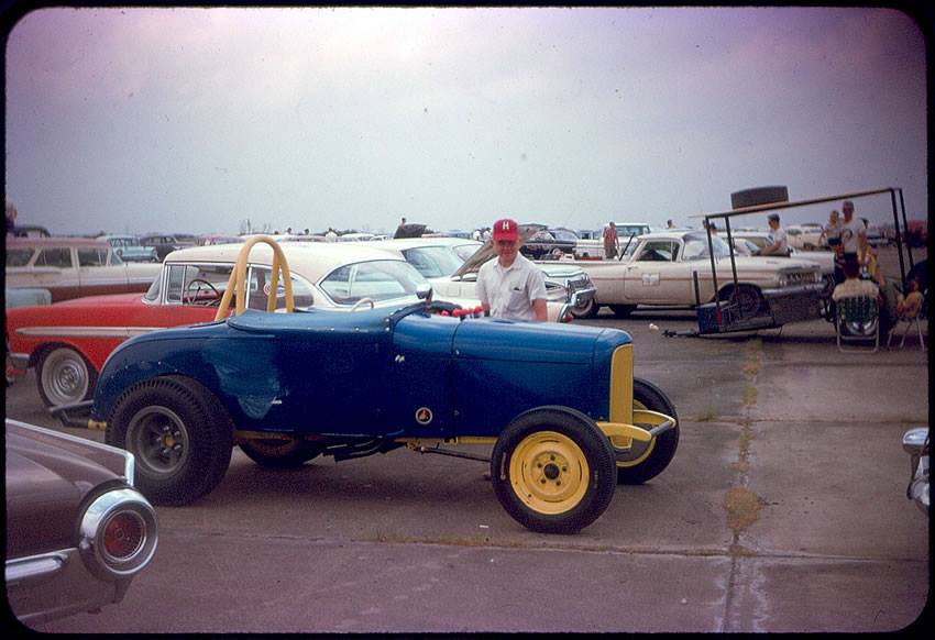 Yep, that's around May of '63. Kaye Trapp was there that Sunday shooting photos. He was driving the Grabowski built T touring. He asked if it was OK if he shot some pics of the roadster. He sent me about five really nice 8X10's. That's one of Kaye's shots. I sure wish he would have hung around. That afternoon we raced Bones in Maz's corvette for street eliminator. Both cars looked good in the sun with their Junior candy paint, and at the lights we both tossed the identical red white and blue Deist ring slots. And, and as they say, "the crowd went wild"!
