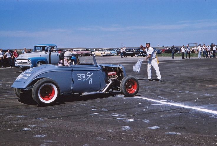 Not in motion, not even at the drag strip...but pretty historic...Willy Borsch on the left, Al Marcellus on the right, forgot who is in the middle. Al Marcellus ran a street roadster for several years before he partnered with Willy. The roadster in this picture was possibly the forerunner of the "Winged Express," as H.R. Harrell and Willy Borsch ran a '29 roadster, initially with a flathead, then with a gas Chrysler, then a blown Chrysler before switching to the T body.