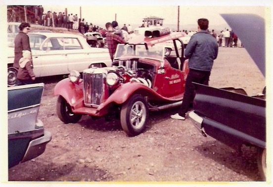 Not quite "in motion" but getting ready for motion. Dover dragstrip pits circa 1964.