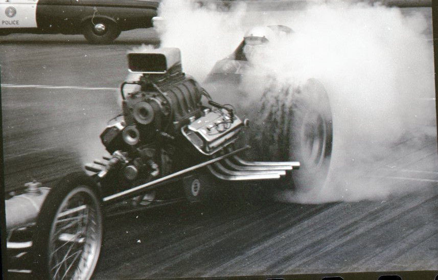 Cagle & Callahan, Riverside, around '59. Gary Cagle was still running a chain drive when this photo was taken, and the chain departed off the starting line, fortunately passing between two spectators. Chain guards would follow...then Gilmer drives