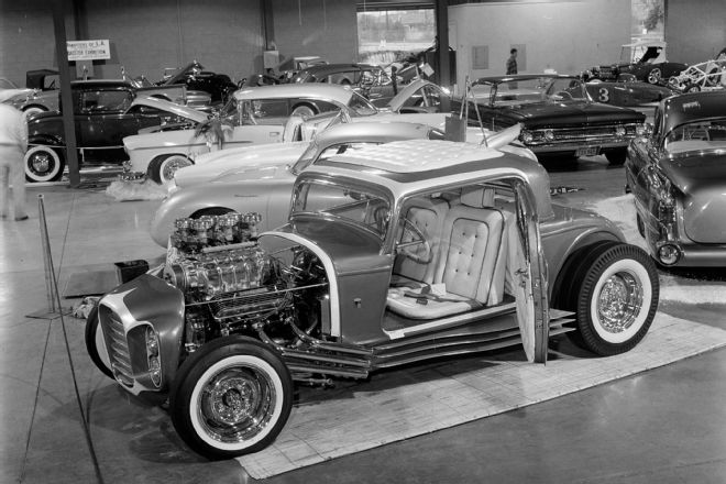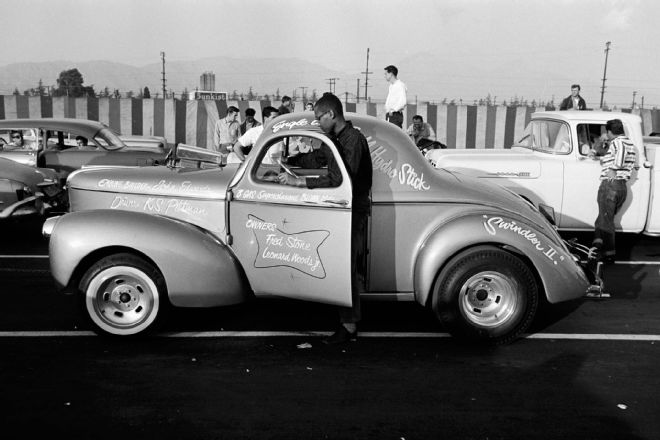 The so-called "Football Austin," for its shape. This followed Big John Mazmanian's candy Willys, with body work by Gil Ayala, the famous customizer. Gil and Mazmanian were friends from right after WWII on, with Gil customizing a Merc convertible for Mazmanian in the '40s. Gil was known best for his customs, but he was a hot rodder too, usually fitting his own customs with highly modified engines, some built by famous drag racer Fritz Voight, who did much of the work on Mickey Thompson's Challenger.