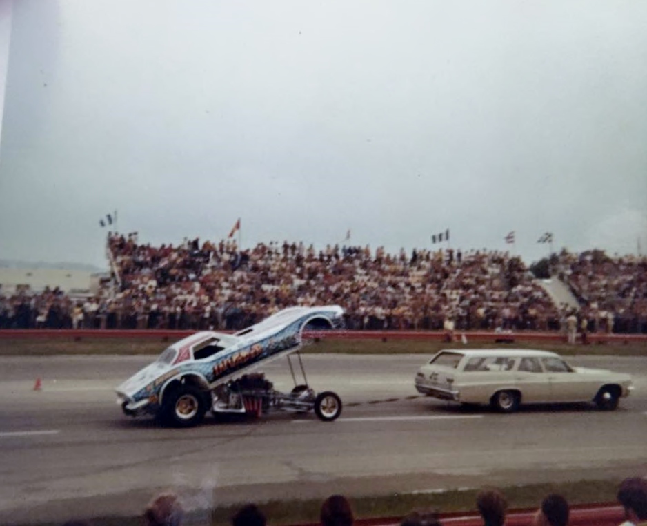 8. A curios picture!! I'm guessing one of Mike Van Zandt's Invader Corvettes. Nothing like a nitro fueled on fire fiberglass body being fought by a bunch of guys in t shirts! Look at the guys in the background, hands in their pockets like nothing is happening!