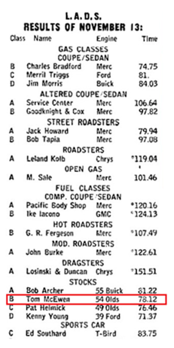 November 13, 1955: One month after the Lion’s Dragstrip grand opening, McEwen wins his first trophy…? With a 1954 Oldsmobile sedan? So, the order was 1954 Olds, 55 Chevy, 56 Chevy and 57 Chevy... all labeled: "It came that way from the factory..." Ha!