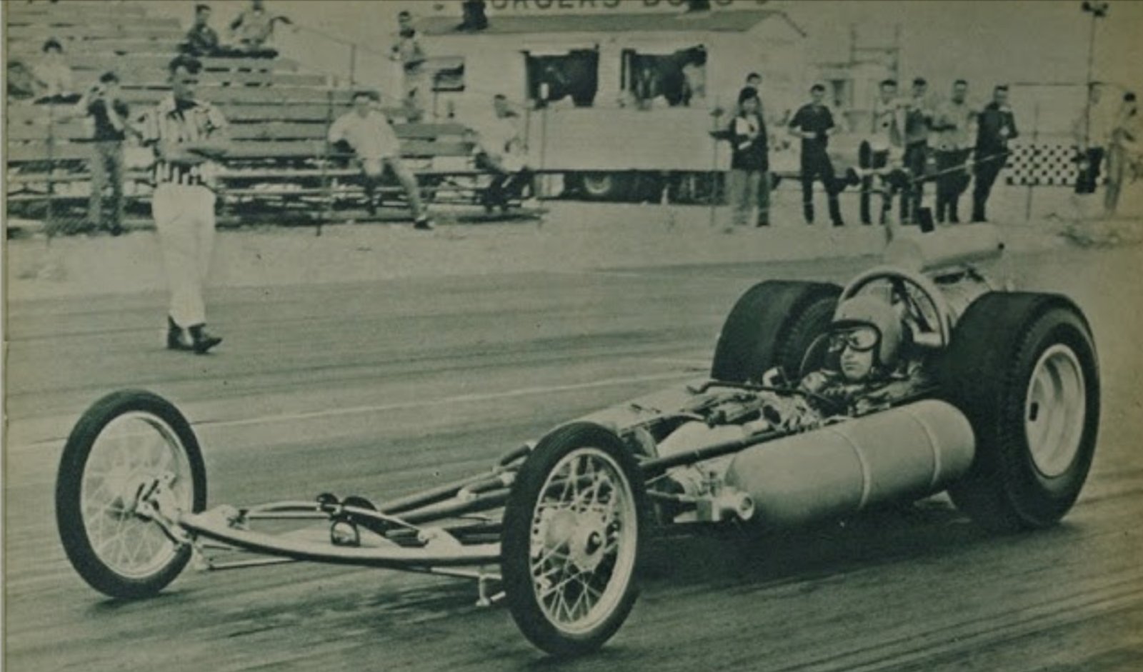 Lets not forget the West coast’s twin SBC motor FED during the late 1959-60 era. The above photo shows Lefty Mudersbach in the pits doing some adjustment work while his son has one of those famous tasty Lion’s Dragstrip hot dogs. I can attest that those hot dogs from the pits snack bar stand prepped by my H.S. friends working there, were the best around. Add in a chili topping for a different meal and lunch + dinner are covered. Yes!