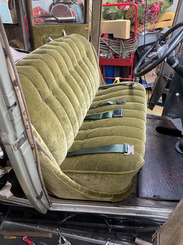 And for anyone who would care, here's the seat belts mounted behind the bottom cushion to the seat carriage/frame. Technically, the bottom of the back seat cushion cover was/is supposed to be attached to that wood rail you see standing up just below the seat belts. I hog ringed the cover to the back of the spring instead so I didn't have to run the seat belts through the cover. As a quick reminder, since I showed it 2 years ago, the bolts are carriage bolts and washers welded to the back of the seat frame and are covered by the seat frame cover. Here's the back of the seat frame again before the padding and cover...