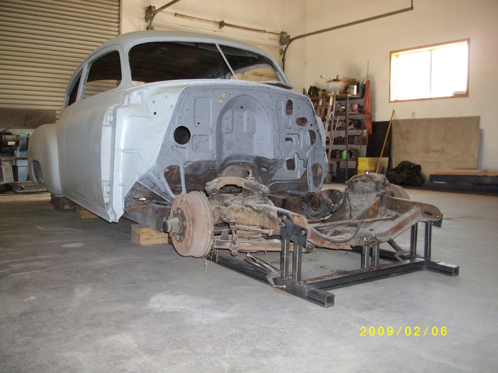 It has a 68-72 nova sub, I graft it on as high in 53 frame as possible, stock springs and spindles, rides like a dream, rear is same deal, nova springs inside of frame, granada 8inch rear,