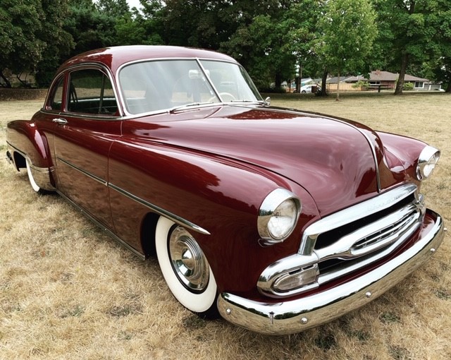 I hereby submit my coupe for consideration. Skirts coming and headlite visors going. 46 Packard grille,40 Chev hedlite pods, 34-5 Chev Master hood sides IMG_0696.jpg Rollete full side field in Maine view.jpg