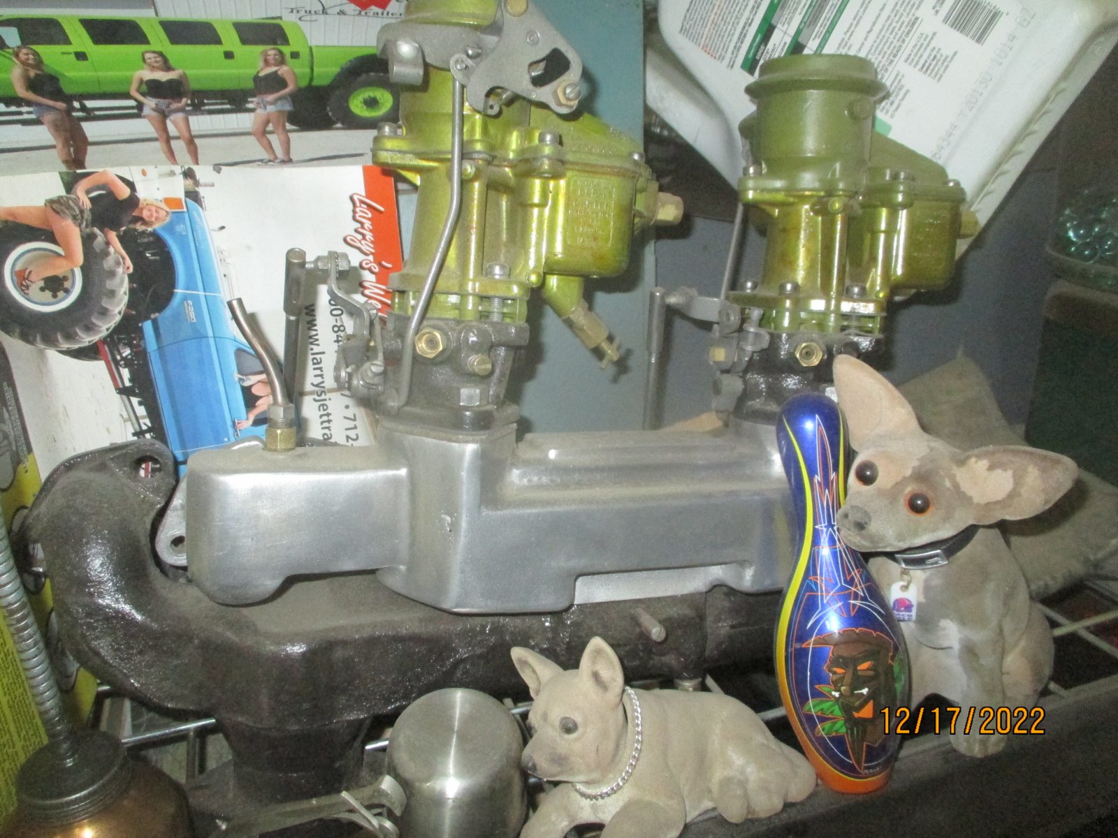 I picked up this 327 and I think it's pretty cool. It uses all stock Chevy parts...for example..the block is a 1965..the heads are 1968 camel hump. The intake is a 1965 300 horse deal for a Carter carb. Has the matching 3721 Carter carb. Also came with an 891 iron dual point. Has a finned balancer and a curved water neck. To top it off is a pair of sand cast Edelbrock valve covers. Pretty sure it has L79 style pistons. Was probably built in the late 60s or early 70s..came out of a big Austin Healey.