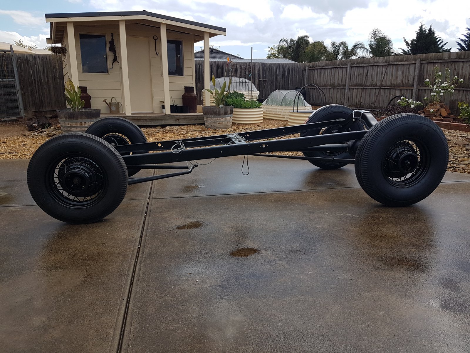 Ive built a Model A chassis running a 4" dropped SoCal front axle; rear suspension is a reversed eye main leaf and three other leafs on top and 4 cut short leafs under the main leaf to fill out the pack; juice brakes - not yet plumbed; 35 wires with 750 Firestones on the rear and 600 on the fronts. Im worried I have too much rake and would like to get the rear down more and am thinking about stepping the chassis using the Tardel method (2 1/2"). Will the rear unsplit radius rods hit the chassis when it bottoms out if stepped? Hoping someone has stepped there otherwise stock banger set up that can provide advice TIA 20191012_145249.jpg