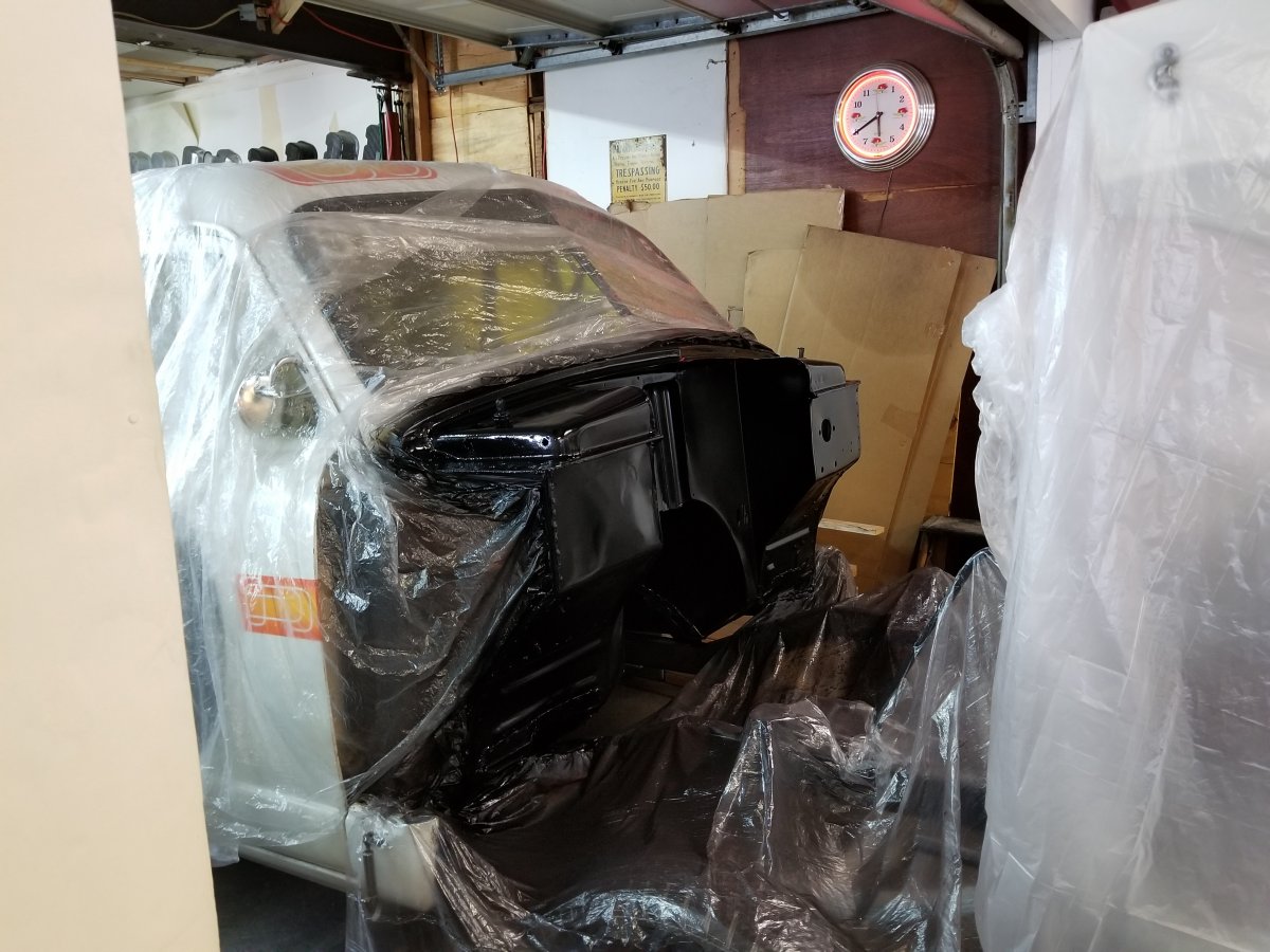Firewall doesn't look to bad so I proceeded with installing the stainless insert, a tough lesson learned to see how accessible your mounting holes will be on the inside of the firewall. Me and my 15 yr old son fought with the stainless hardware for over 4 hrs, climbing over the roll bar, trying to lay across the fiberglass racing seats, shoving your hand in a 2 inch gap behind the dash blind to put nylock nuts on. I had to remove the steering column, gauge panel, swinging brake pedal bracket, move wiring, ugh, should've just used aluminum rivets. Then I spent an hour and a half moving things to get the car moved forward under the chain fall on trolley and moving the engine/trans from the back section forward to the same spot. I blanketed up to protect my new shiny firewall and realized I was missing the motor mount bolts, where the heck did I put those damn things. What normally works for me working by myself is to thread the engine/trans nose first in between the radiator support loops and new shiny firewall until it's over the chassis. Then I roll the car back until there's enough room to rotate the combo the correct direction in between the fiberglass tilt front end and shiny new firewall, then lower chain, roll car forward, lower chain, roll car forward, lower chain, roll car forward, lower chain until it slides home and onto the motor mounts like a glove.