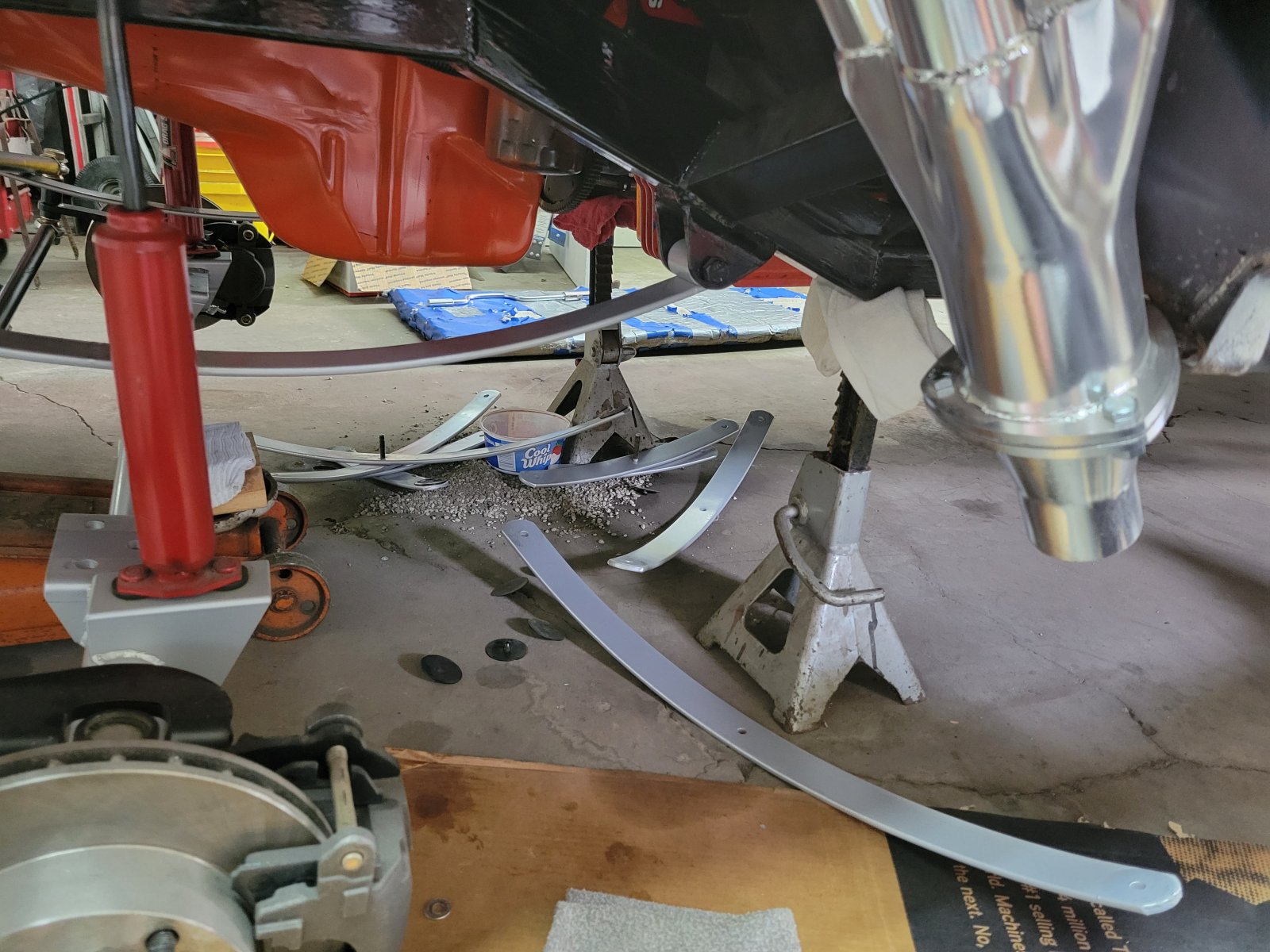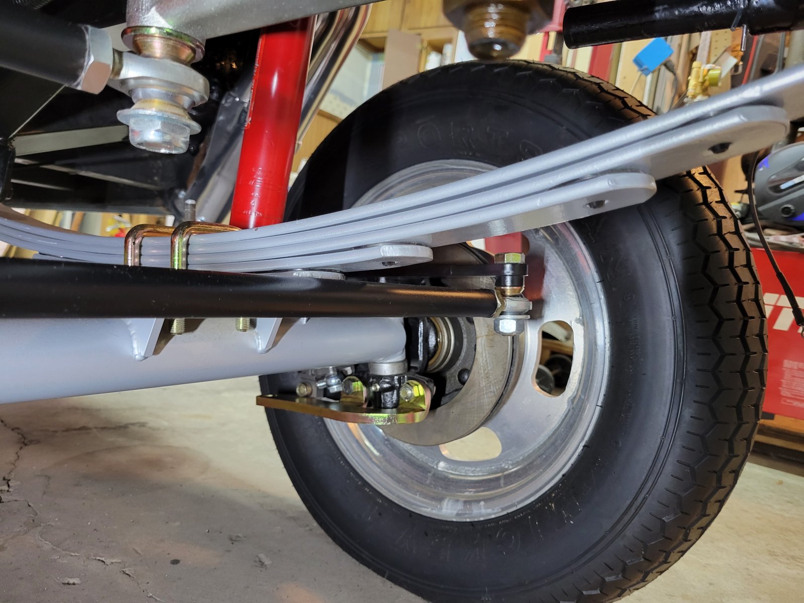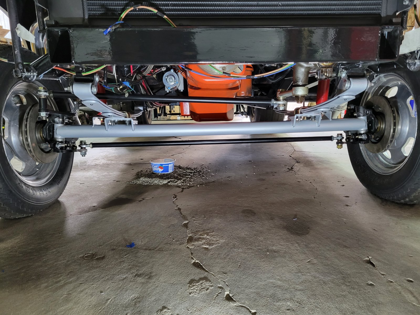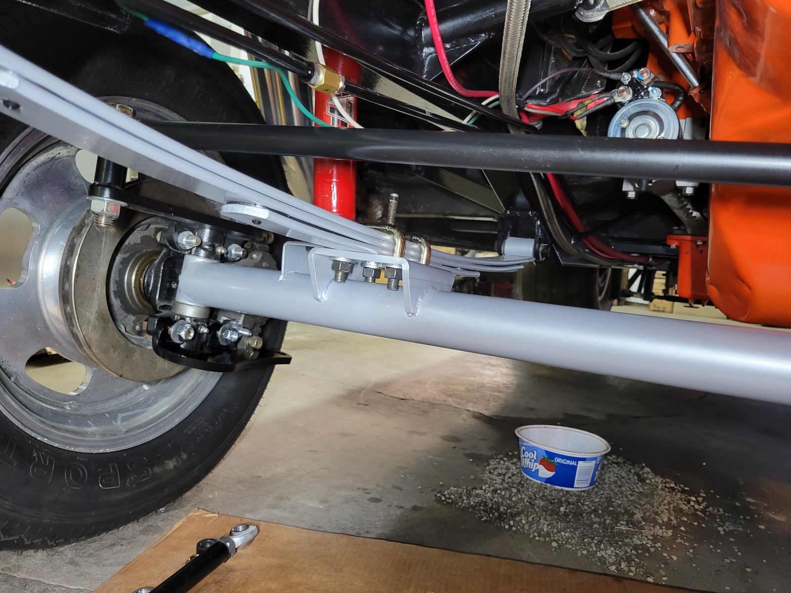 I did stand on the front frame rails and gave it a bounce test, stiff as a prick, looks like I'll be taking another leaf out of this thing and that might force me to put the tie-rod behind the axle off the lower spindle bolts. The springs are really close to the tie-rod, maybe a spacer will work to drop it a little.