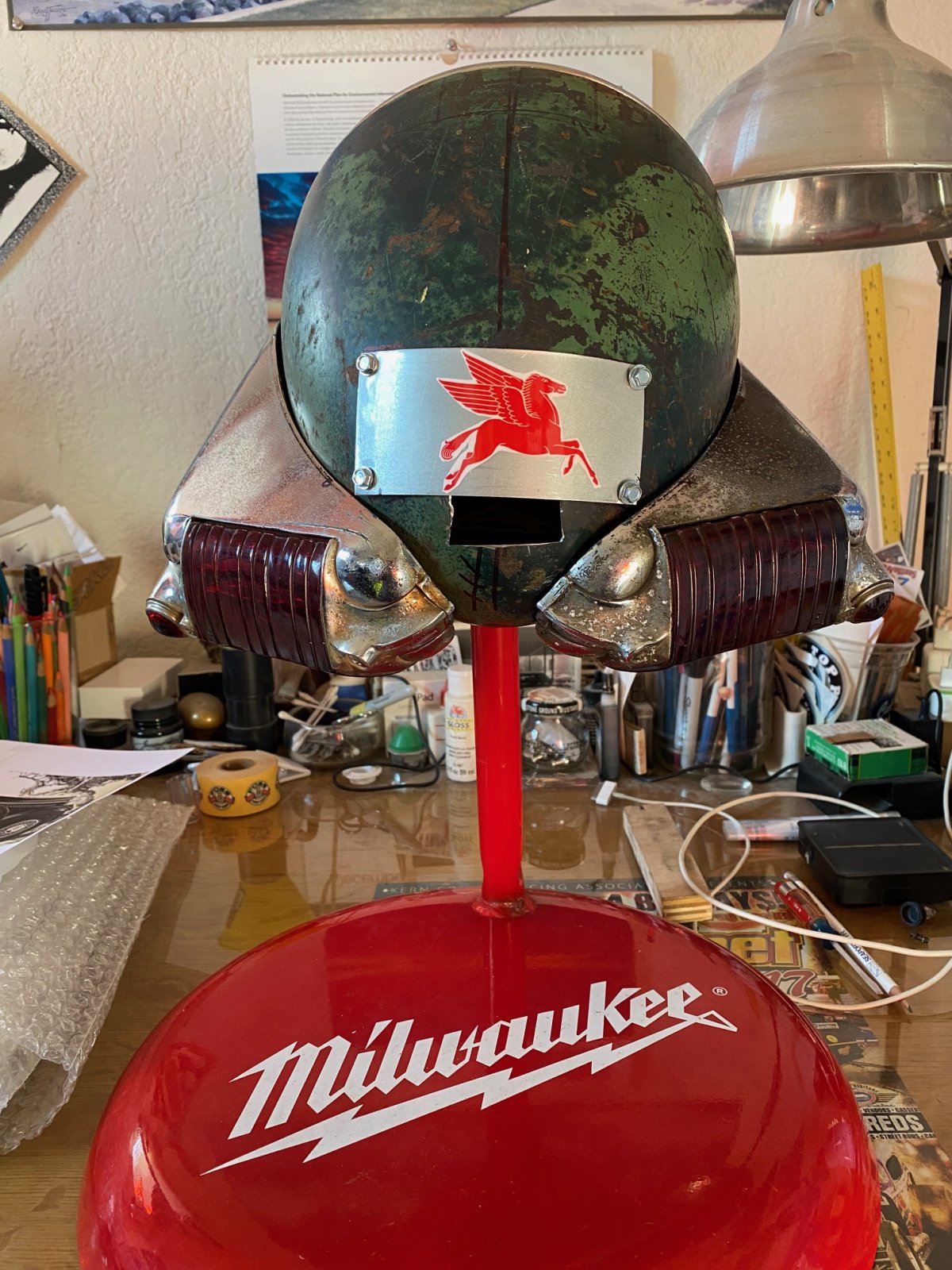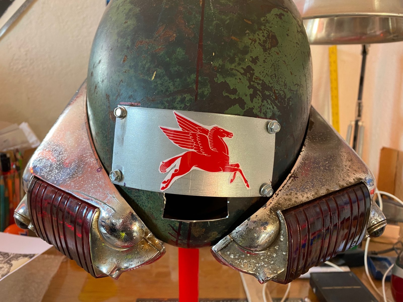 It's so easy to get side tracked and distracted, by a million cool objects here in my old hippy shack, domicile, museum of the cool and absurd. At the end of my couch is this cool vintage Fire Helmet. I noticed that I had decorated it with some cool vintage license plate reflectors. So like a good Crow, I will detach the two cool green units from the front of this helmet, and replace them with a couple of extra yellow, not so cool, boring yellow reflectors. "Nature abhors a vacuum" Since I have not started on the reassembly of the Headlight unit just yet, with all of its guts and so forth, I think the addition of these two Green reflectors, strategically placed, will help to embellish, this already cool "BUCK ROGERS" art deco, space nerd, signal transmitting, rescue beacon! Yes, the Pontiac hood ornament, can also double as a cool antenna! Or something like that. Stay tuned for more exciting updates, on the cosmetic embellishments of this project! Thanks from Dennis.