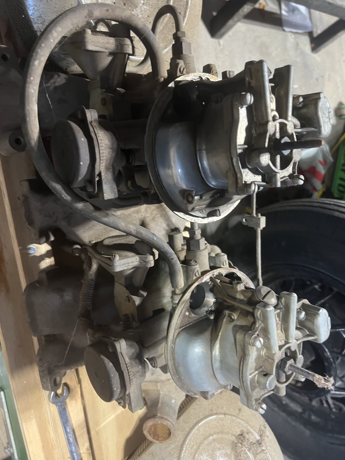 Up for sale is a very cool ford Y block aluminum dual quad intake , carbs and matching air cleaners. I found this in a basement while extracting a Model A ( yes the car was in the basement ) it’s covered in basement ( barn lol) dust. I was going to try and clean up, but I figure the next guy can go through it as they want. I believe this set up is for a T bird, but the air cleaners are def aftermarket and not OE ford. I only could find one other picture of them on the Hamb in someone’s hot rod. Looks to be mostly complete with linkage and all. price is OBO. Don’t hesitate to send offers !