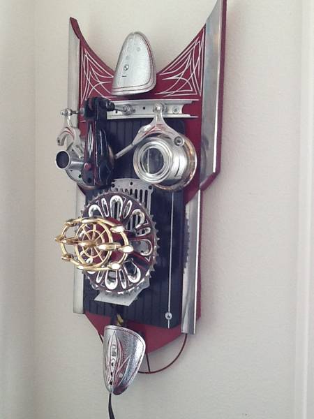 Mask of misc parts, I built, and recently striped it. The eye has a small LCD screen that does a slideshow of artwork I've done, the other eye has my info magnified inside. The mouth has a fan that blows air at you, and the lower shoehorn thing has a light bulb which gives the whole piece a cool lighting effect. Hope you fella like it!