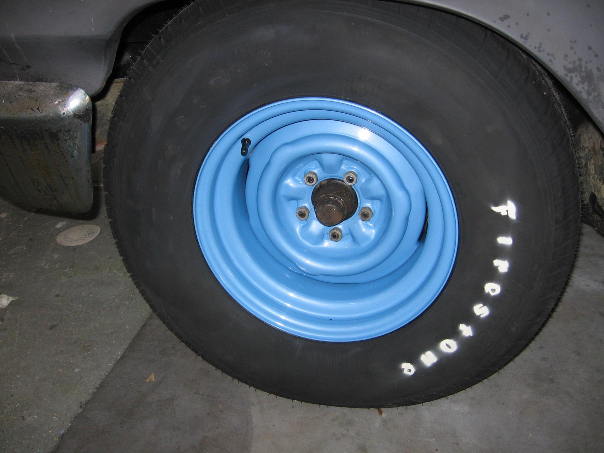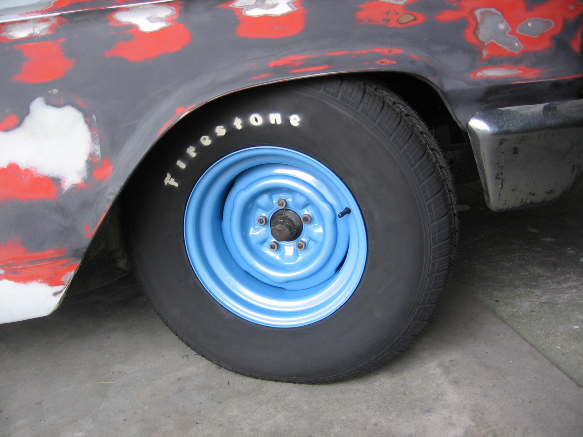 Got the tires installed this morning at Allied Tire, of course they had to have a newer machine as to not damage the paint on the wheel edges. Other than a few nicks in the center hub area they came out good, with the wheel balancing .5 oz one wheel, 1 oz another, zero weights for one, and 2.5 fo the last it appeared thw wheel had a defect but we got it balanced out. So I have attached the pictures for your feedback, the guys at the tire shop thought they were old race tires until they say the other side of the tires, all thought they were cool looking shaved and retro Firstone logo's. I think it fits the race look. Next job is mounting the front ones to see what i have to modify as these are very tall and wide wit hthe 8" wheel and wider contact patch. Hopefully I will only have to roll the outer fender lip and maybe trim the inner fender keeping my fingers crossed. Well give me some feedback do they look like a early Stock car race wheel & tire? Thanks for the feedback.