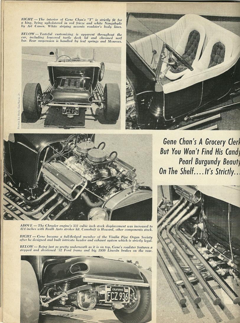 Ok, small world time. I was at the local cruise night at the A&W tonight, and some guy left half a dozen mid seventies street rodder back issues there as reading material. There were only two that I didnt have at home, so I grabbed them, sat down with my daughter and was flipping through them as I was eating. Low and behold, at the bottom of pg 52, Feb 76, is a rear shot of an unmistakable turtle deck T bucket with frenched tail-lights, taken at some mid-seventies rod run. Chip, do you have Feb. 76? Check pg 52, GOTTA be the Chan car! Oh yea, and PS, in my pile of parts that is slated to someday become a sixties style T bucket is a seventies fiberglass racing bucket with the head-rest cut off, and the resulting gap filled with resin and matt, just waiting for me to get off my ass and pull a mold off it.
