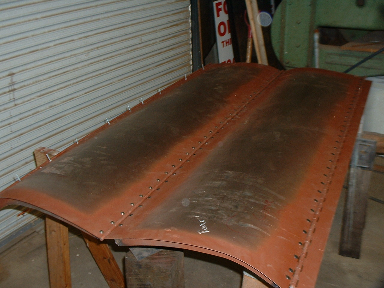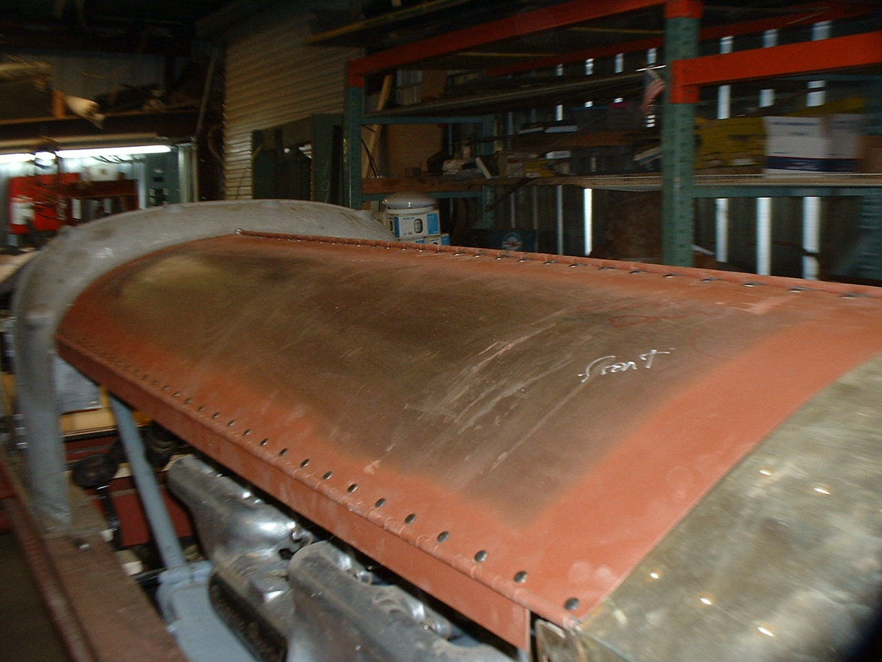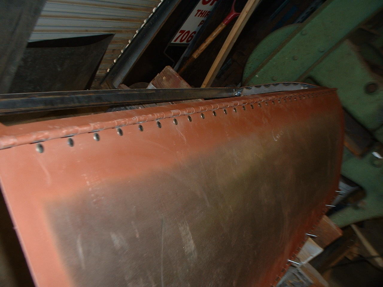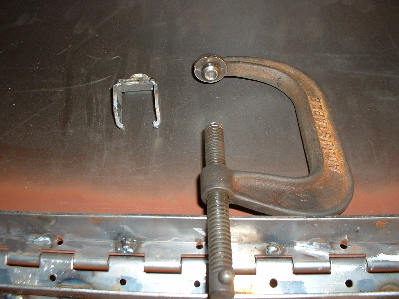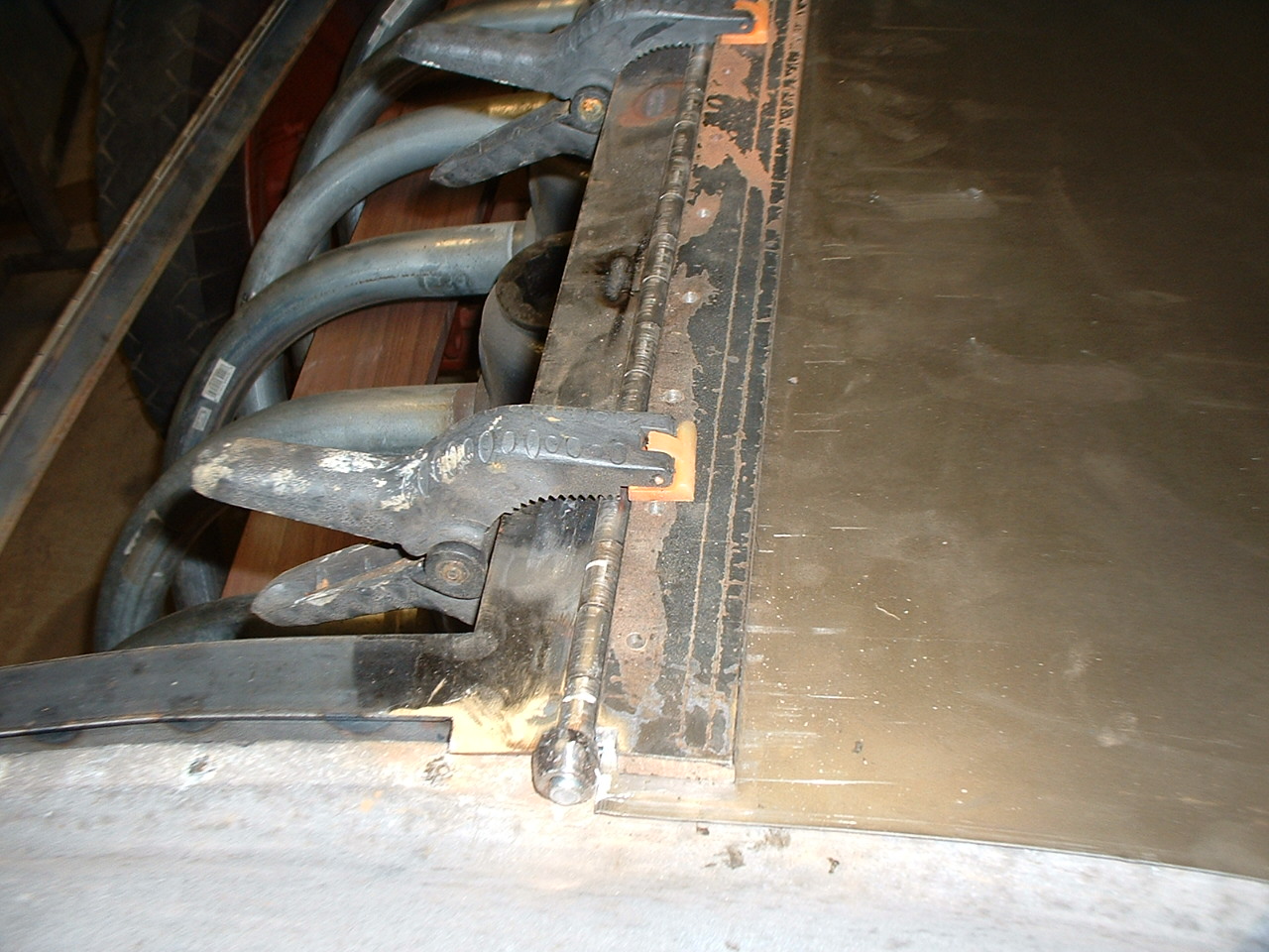 The hood is very tedious. All those holes to drill and deburr--bummer. After shooting a coat of red oxide on the parts that touch I got down to serious riveting. Unfortunately a little screw up on my part made it impossible to beat the rivets in traditional fashion without rebuilding my hood frame. I have long held that the better part of skill comes from the ability to turn a screwup to your advantage. Following that belief I made up a little clamping jig, cinched up the rivets with it and welded the back side. It's not at all pleasant to look at from underneath but the topside shows no difference.