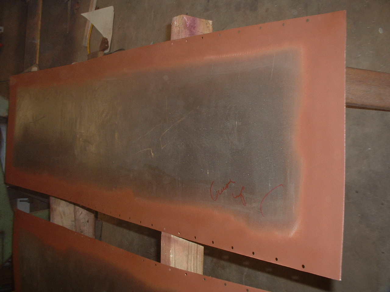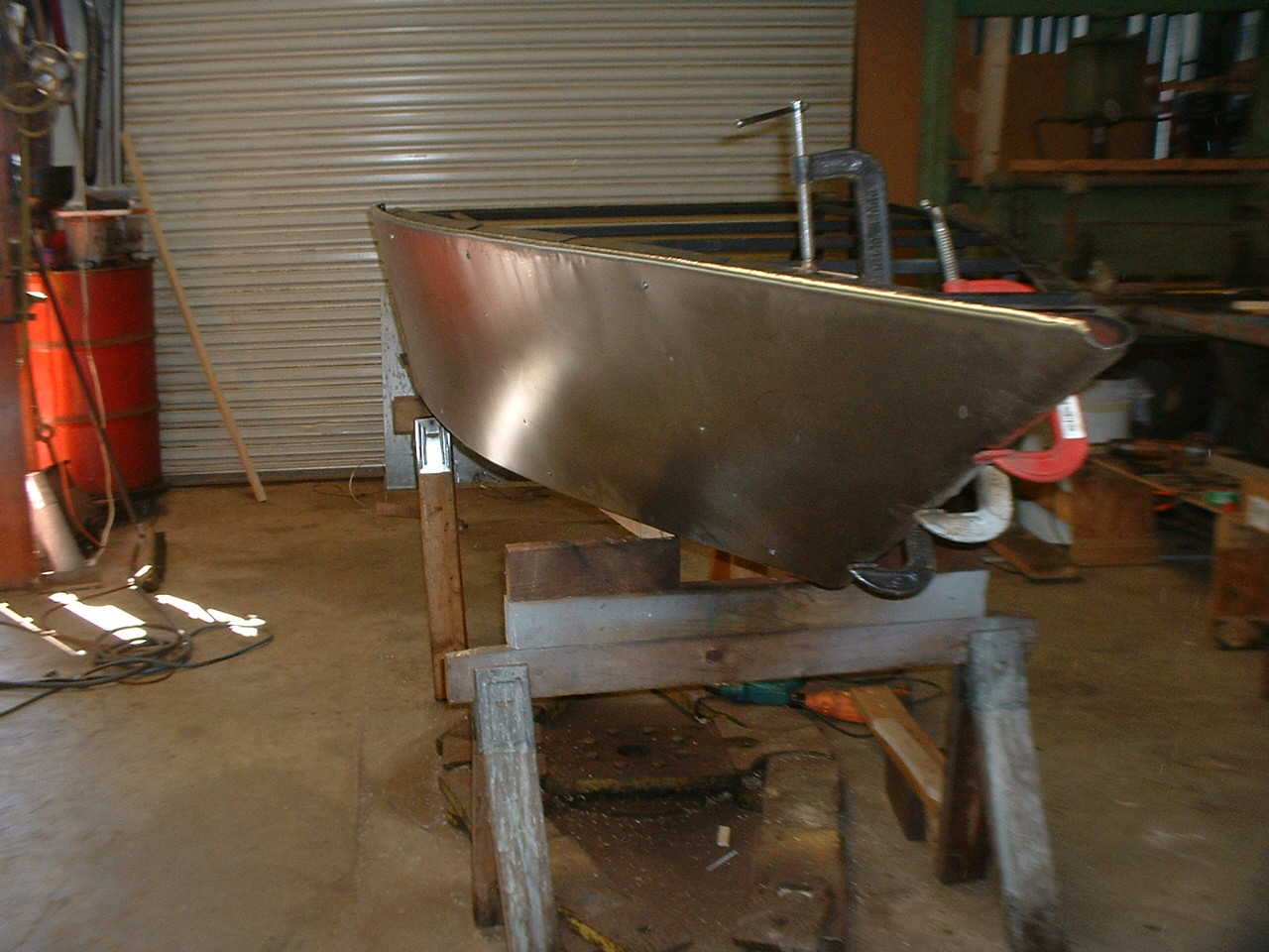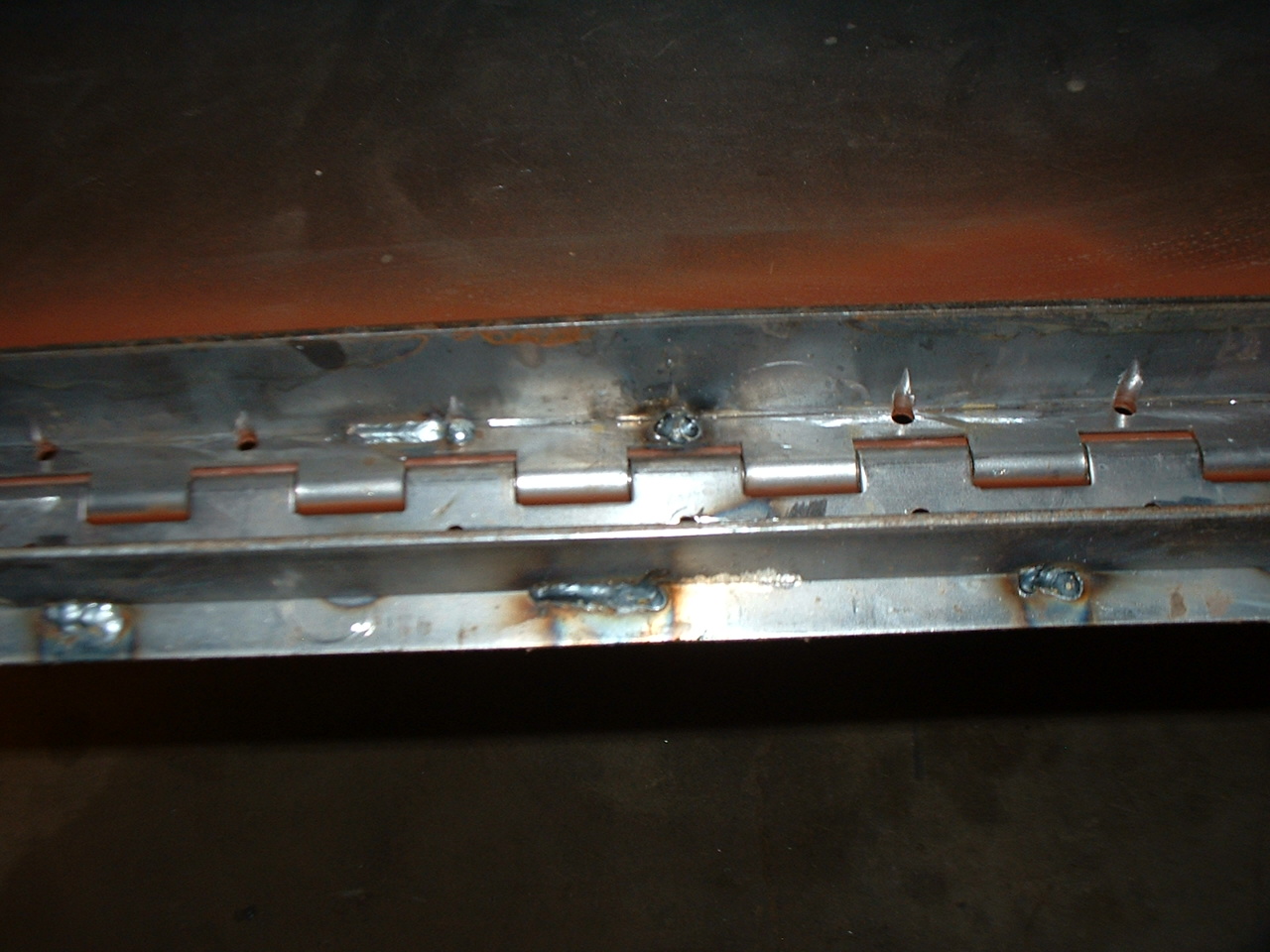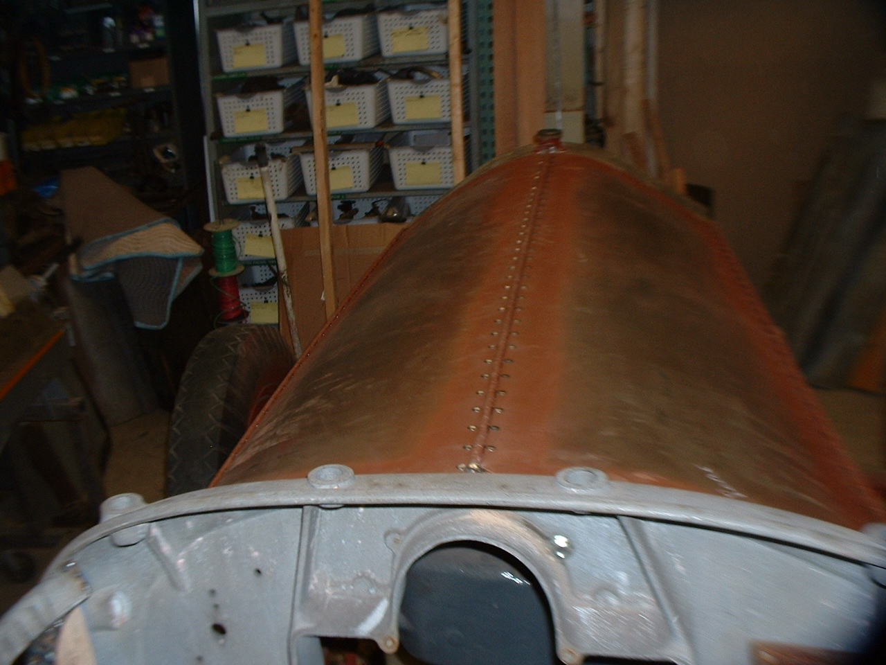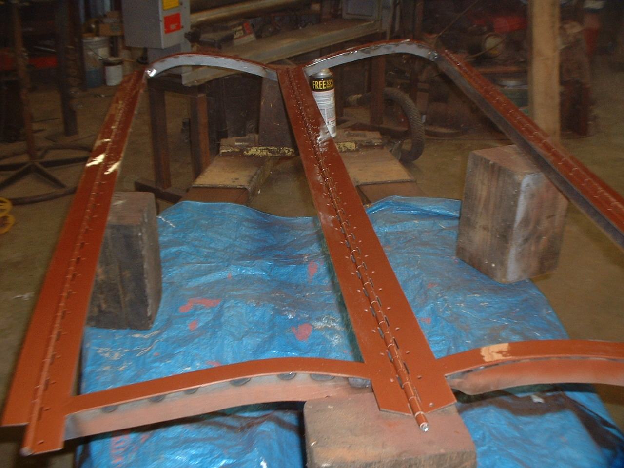 The hood is very tedious. All those holes to drill and deburr--bummer. After shooting a coat of red oxide on the parts that touch I got down to serious riveting. Unfortunately a little screw up on my part made it impossible to beat the rivets in traditional fashion without rebuilding my hood frame. I have long held that the better part of skill comes from the ability to turn a screwup to your advantage. Following that belief I made up a little clamping jig, cinched up the rivets with it and welded the back side. It's not at all pleasant to look at from underneath but the topside shows no difference.