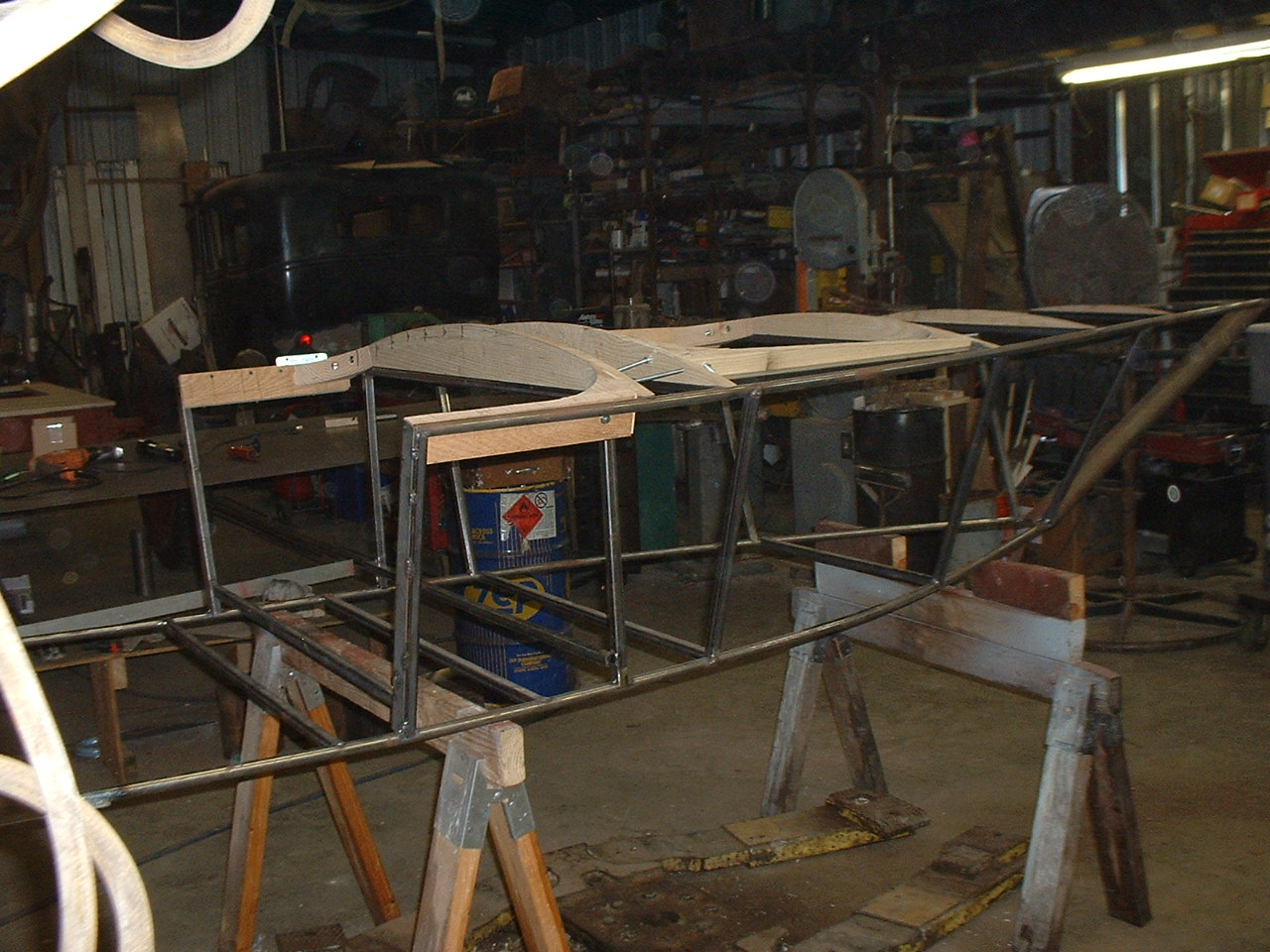 I had to take some time off from the Seagrave to look after business and go rappelling with my son. It was the first time for both of us. Interesting, hanging by a rope on a rock face 60 ft above the earth. When I got back I took the body frame off the car and painted it. Then I painted the wood platform. It's getting down to crunch time on the colors. I want the frame and running gear to be the same color as the body and I'm leaning toward a dark, dark green--BRG maybe with a lighter green for the upholstery. I'm going to paint the body frame black because you won't really be able to see much of it when the car is done and the trim is inside. BTW I'm selling a 1914 Buick touring car on ebay if anyone is interested. http://cgi.ebay.com/ebaymotors/1914...8720169?pt=US_Cars_Trucks&hash=item4cf2a9ab29