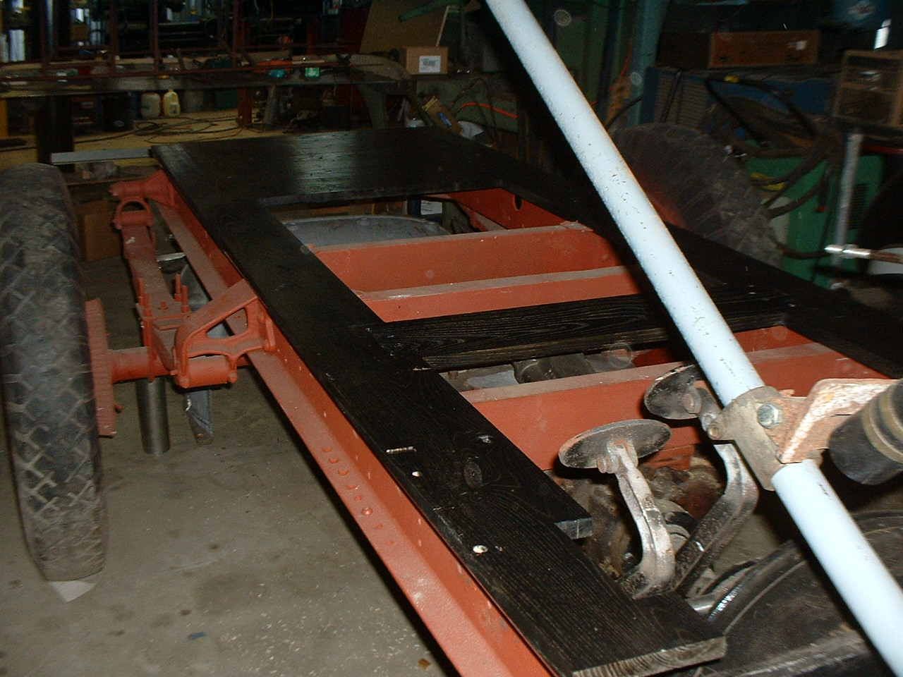 I pulled everything apart. The wood I sprayed with Bullseye and the sheet metal I painted with red primer. Next I'll bolt on the sides and weld the perimeters. I was thinking about a real dark blue for the chassis and a somewhat lighter blue for the body. But what color upholstery? Ivory? Nah, it needs something outlandish. Purple?