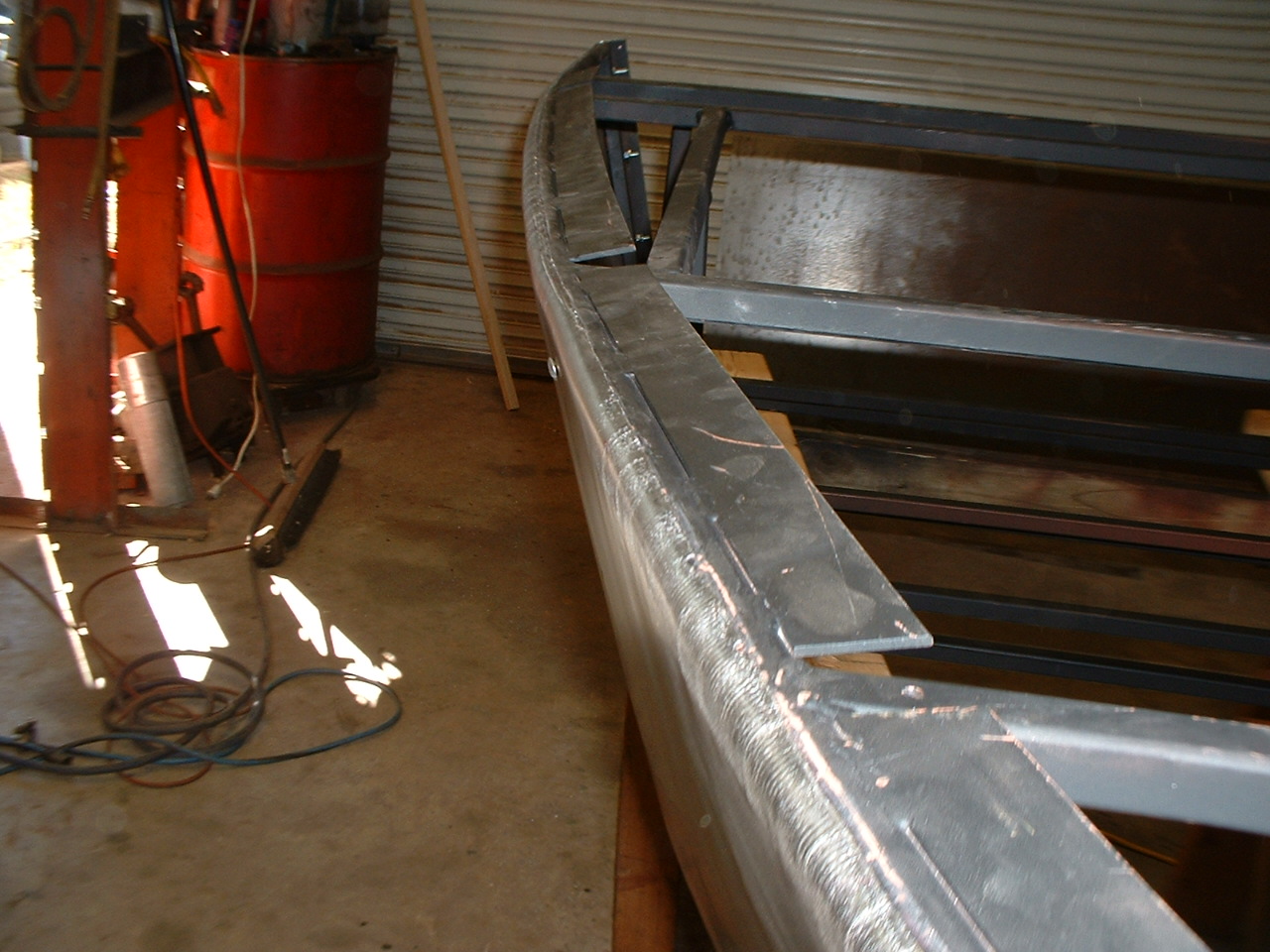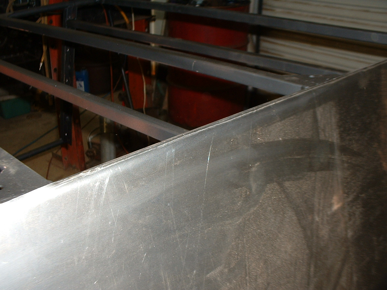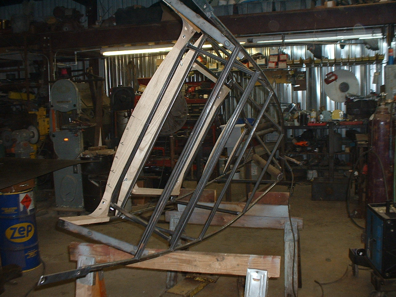 Having all my holes drilled and squared, I had just started bolting the sheet metal in place when a funny thing happened. Instead of laying flat as I anticipated the sheet metal started curling and curving the farther back I went. This was not an unpleasant event. I had long been concerned that a slab sided body would look unsophisticated and amateurish. A slight rounding of the body sides would be much better. To accommodate the curve I had only to make up some hardwood spacers between the metal ribs and the sheet metal. They will not be visible once the interior is in. Feeling just a little proud of this unexpected outcome (even though I had nothing what-so-ever to do with it) I proceeded to peen over the top and bottom edges. The finished product looked so nifty I laid the opposite side sheet metal in place and started drilling holes for the carriage bolts. I'm thinking about colors now--three tone--chassis, body, fenders. I need something out of the ordinary--something awesome--something that befits a behemoth of the road. Any suggestions?