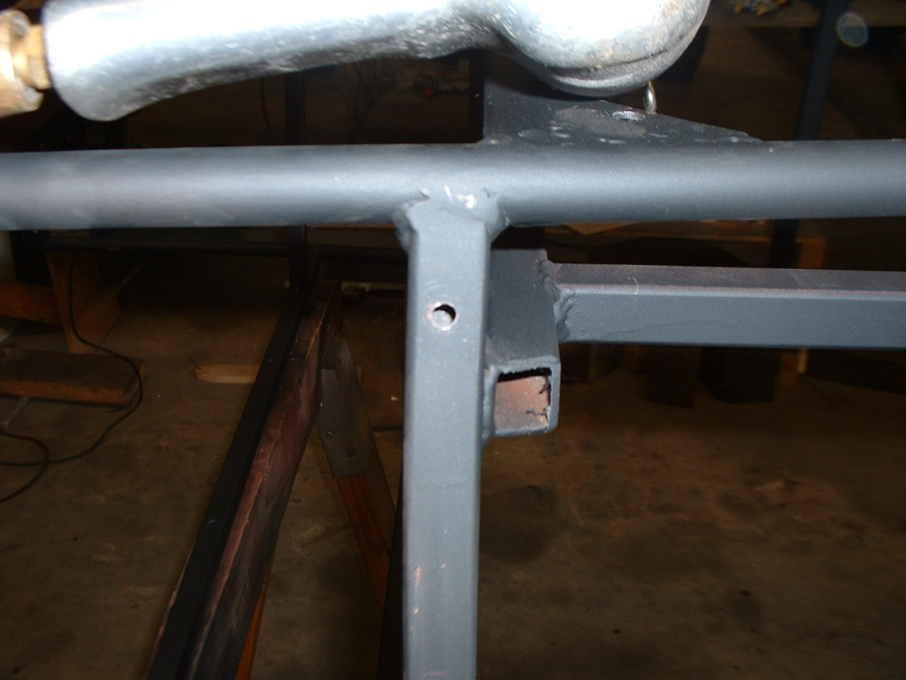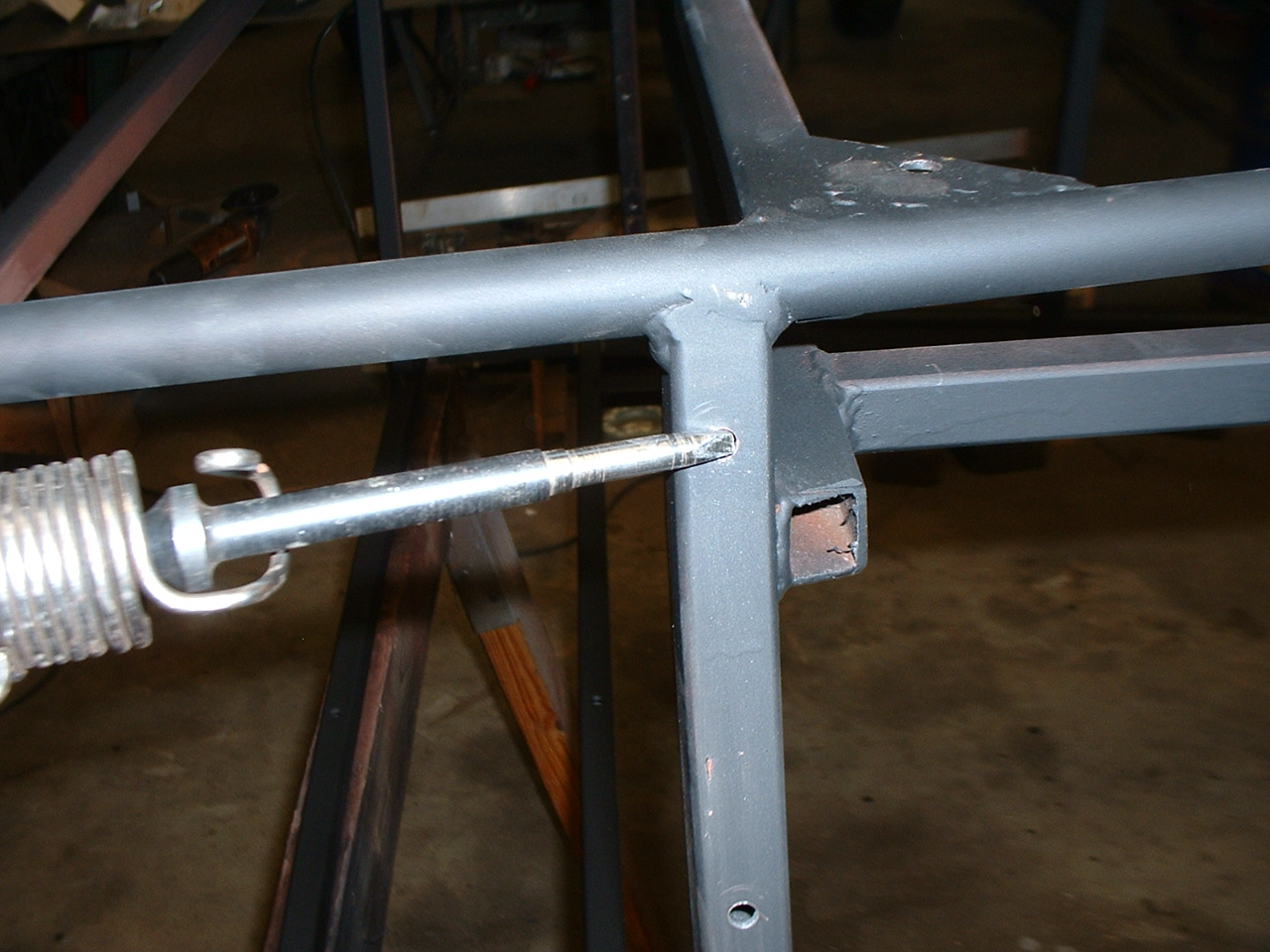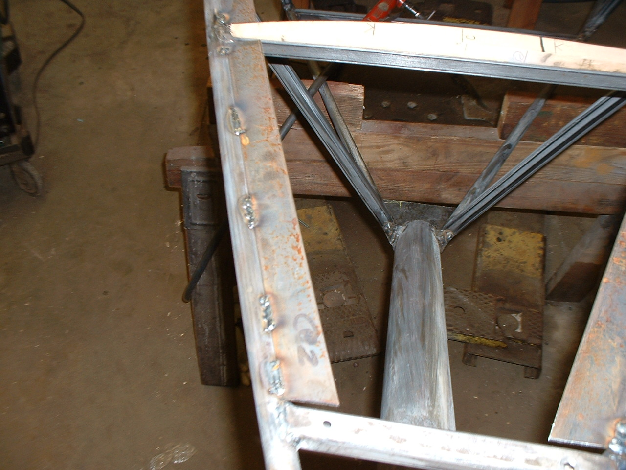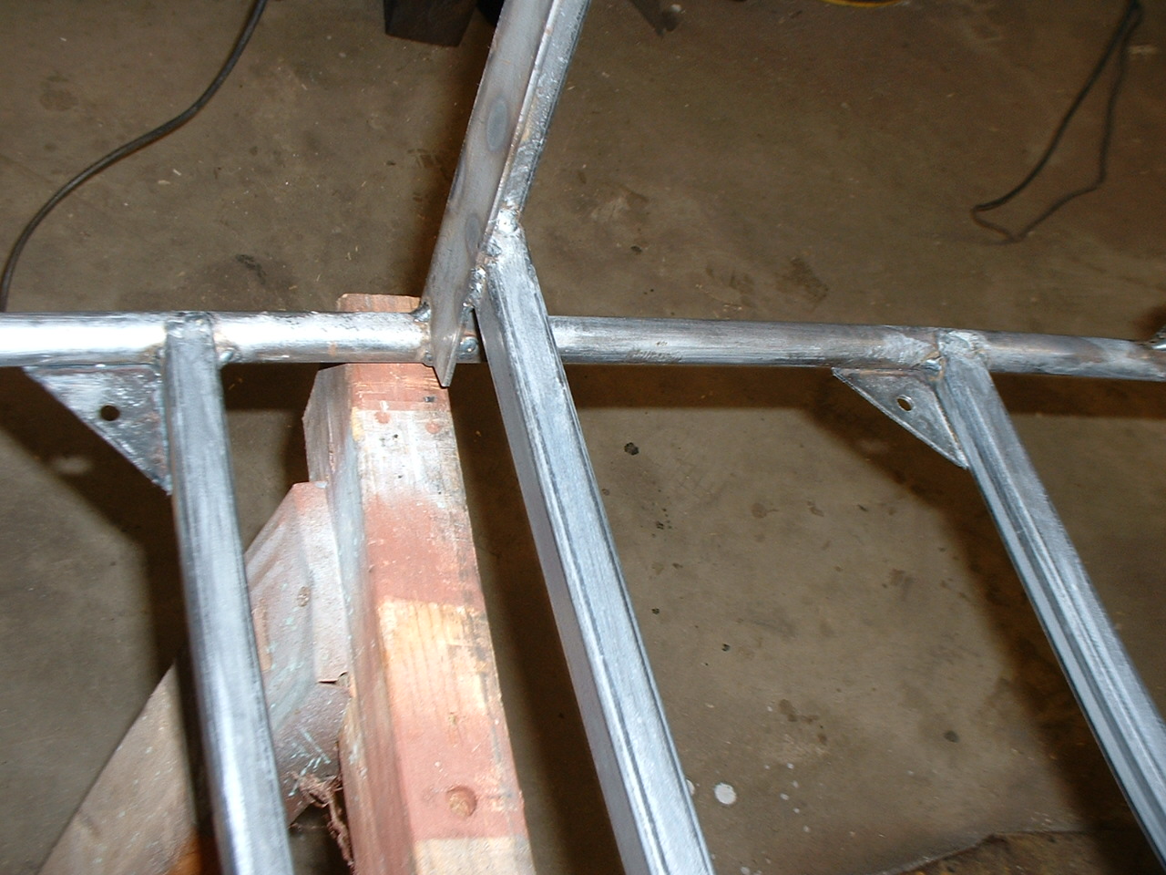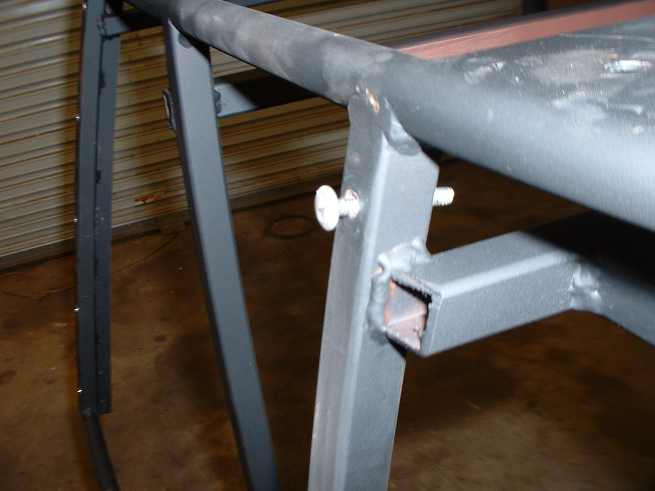 I worked on the pedals shortening them to give me a bit more leg room. I also needed get in there and finish up the master cylinder and gas pedal etc. So the body had to come off. Besides, since I had only tacked the body framework together, I needed to complete the welding. To fasten down the body I added some tabs. They don't look like much but since the wood under the body will be bolted to the frame I think they'll be sufficient. I also added some metal around the top of the body to bolt down the perimeter of the wood deck.