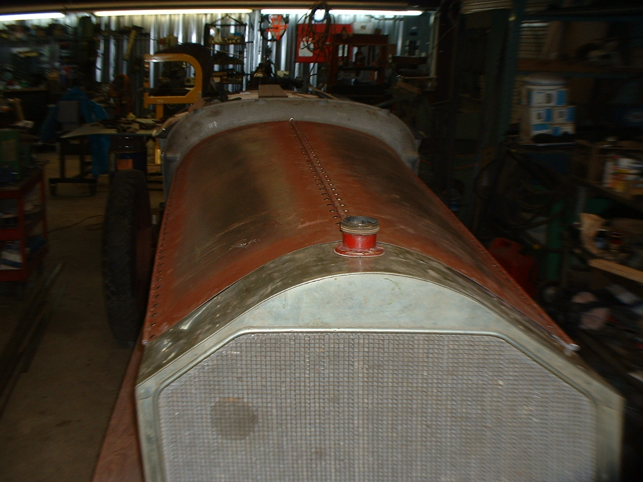 So I fit rivets and welded all day until my back hurt. Then I hoisted the thing onto the Seagrave for a fit check. Looks pretty good. I'll save the sides for later. I've got to contemplate the openings around the exhaust pipe. That side will have to be split. But should I have individual holes around the pipes or one long slot with rounded ends to encompass all the pipes? If I go with the later, I could make an identical slot on the carb side of the hood. Then you could see the engine with the hood down. You could actually see the Seagrave Special on the intake manifold which would be cool. Anyway I've had enough hood work for a while. I think I'm going to work on the pedals, cooling and controls.