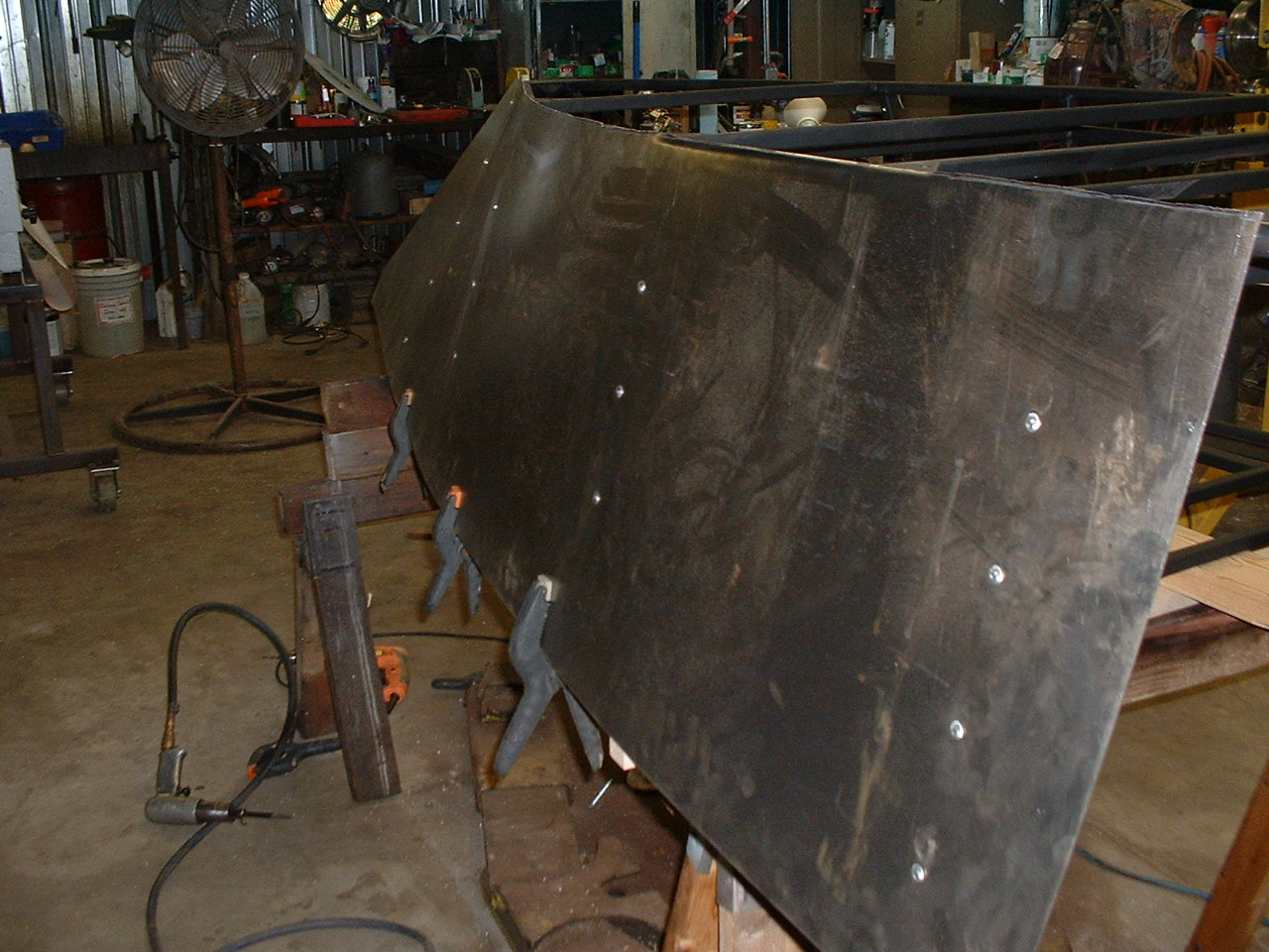 I sprayed some black on the body frame then began drilling holes. I'd planned on using #10 carriage bolts to simulate rivets so I needed a way to square up the holes to receive the head. A squared off air chisel bit did the trick. A few raps and I had a square hole. After squaring about 32 holes, I started on sheet metal. My Chinese nibbler halved a 10 foot sheet of 22 gauge which I then clamped to the frame. Drilling from the backside I made some holes for the carriage bolts. After I had enough bolts in to hold the sheet metal in place I again used the nibbler, this time to trim off the excess sheet metal. A few minutes of hammering and I had a nice rounded edge. You might be able to see all this in my not so focused pictures. Bending the sheet metal around the tail will be the next challenge.