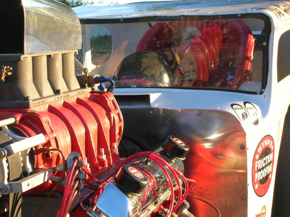 Gretchen and the Gizzle Hopper at Day of the drags at Temple. She is dying to make a hard pass. All I can do to keep her from it. Over the winter, I am going to up-date it some so she can do long hard burnouts.