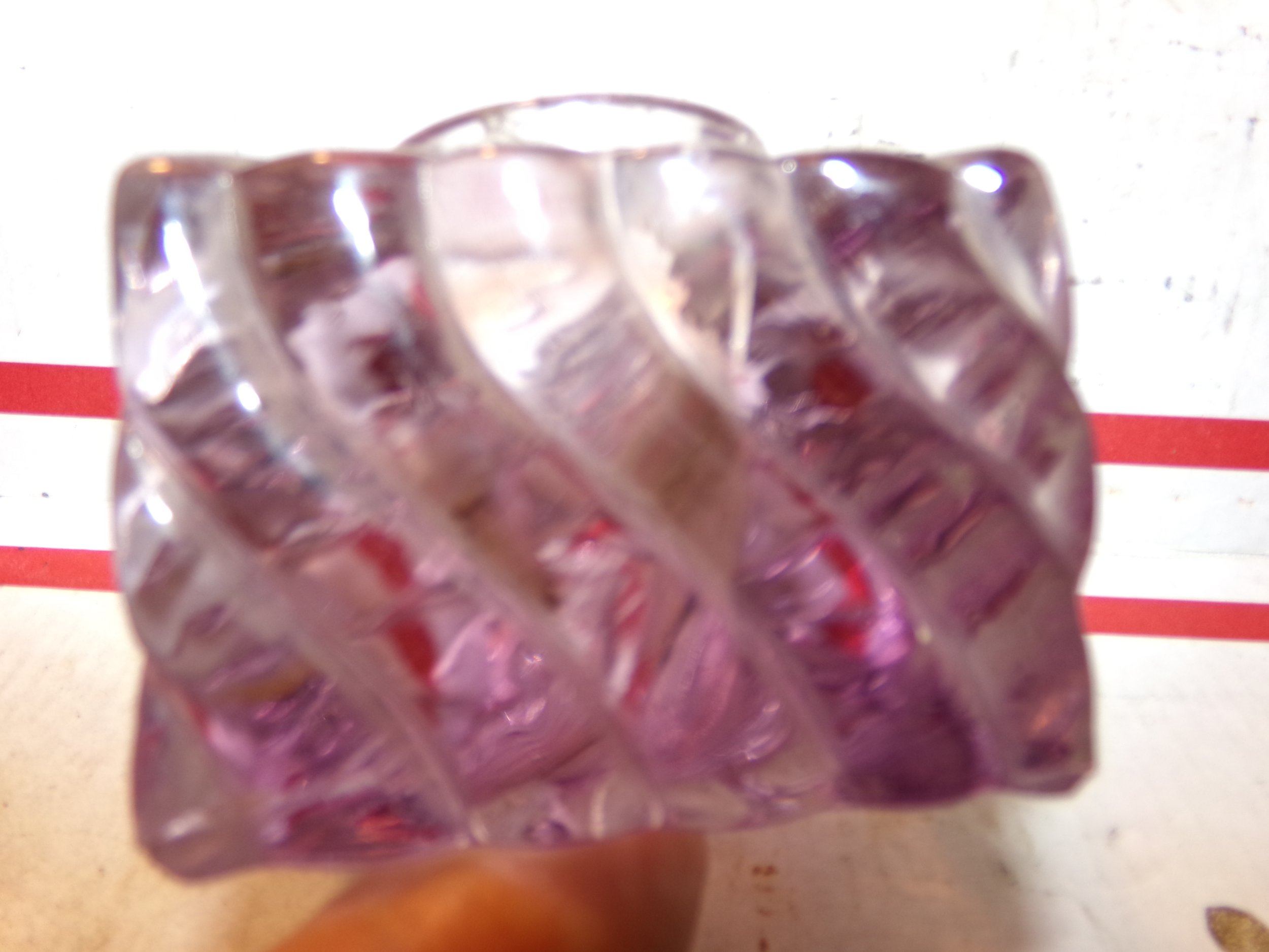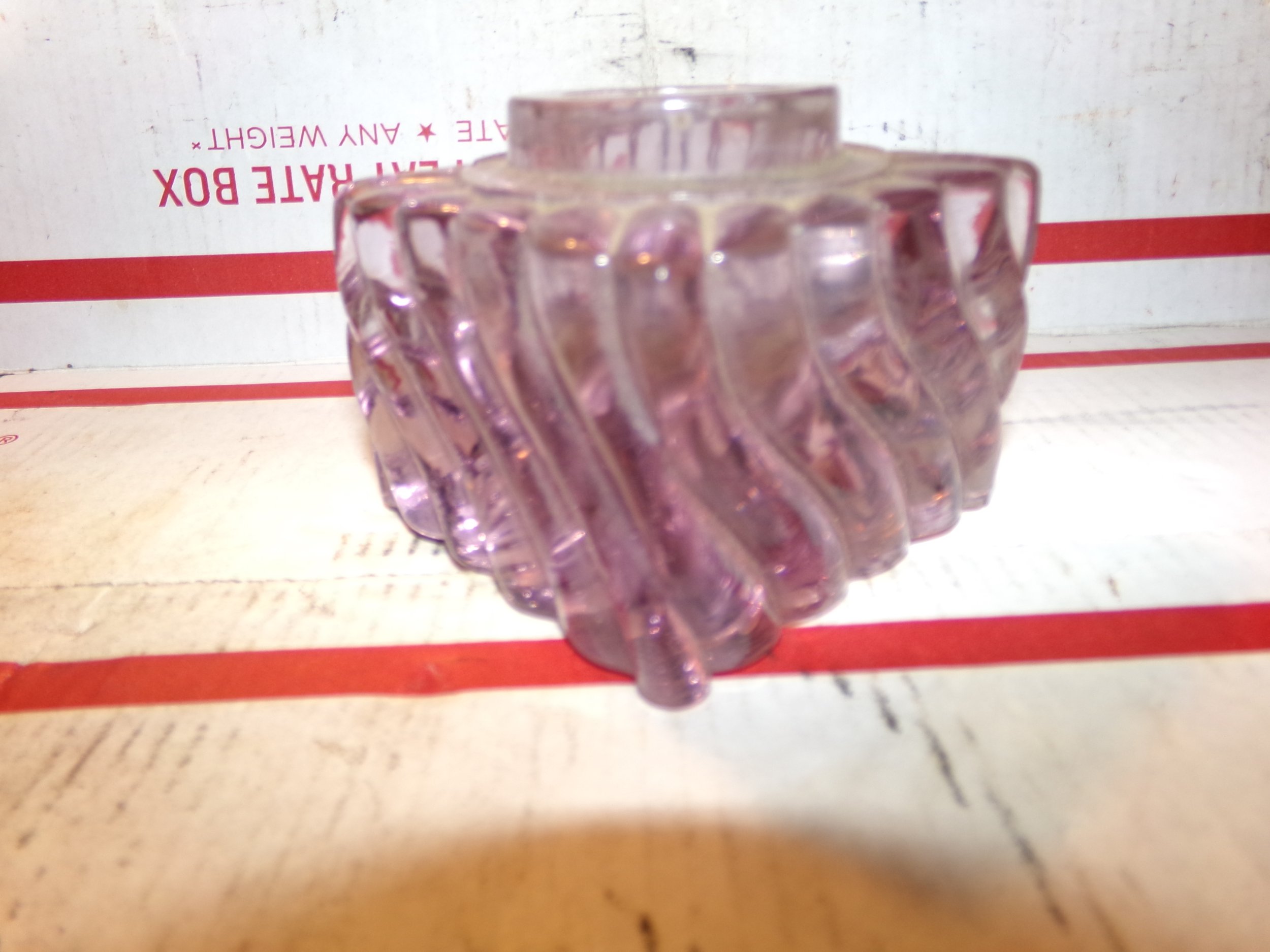 see thru glass with a purple tint. starburst on bottom. swirl on sides. almost excellent condition. 2 small chips on bottom corners. almost invisible until you turn it over. $25.00+$21.00 shipping.