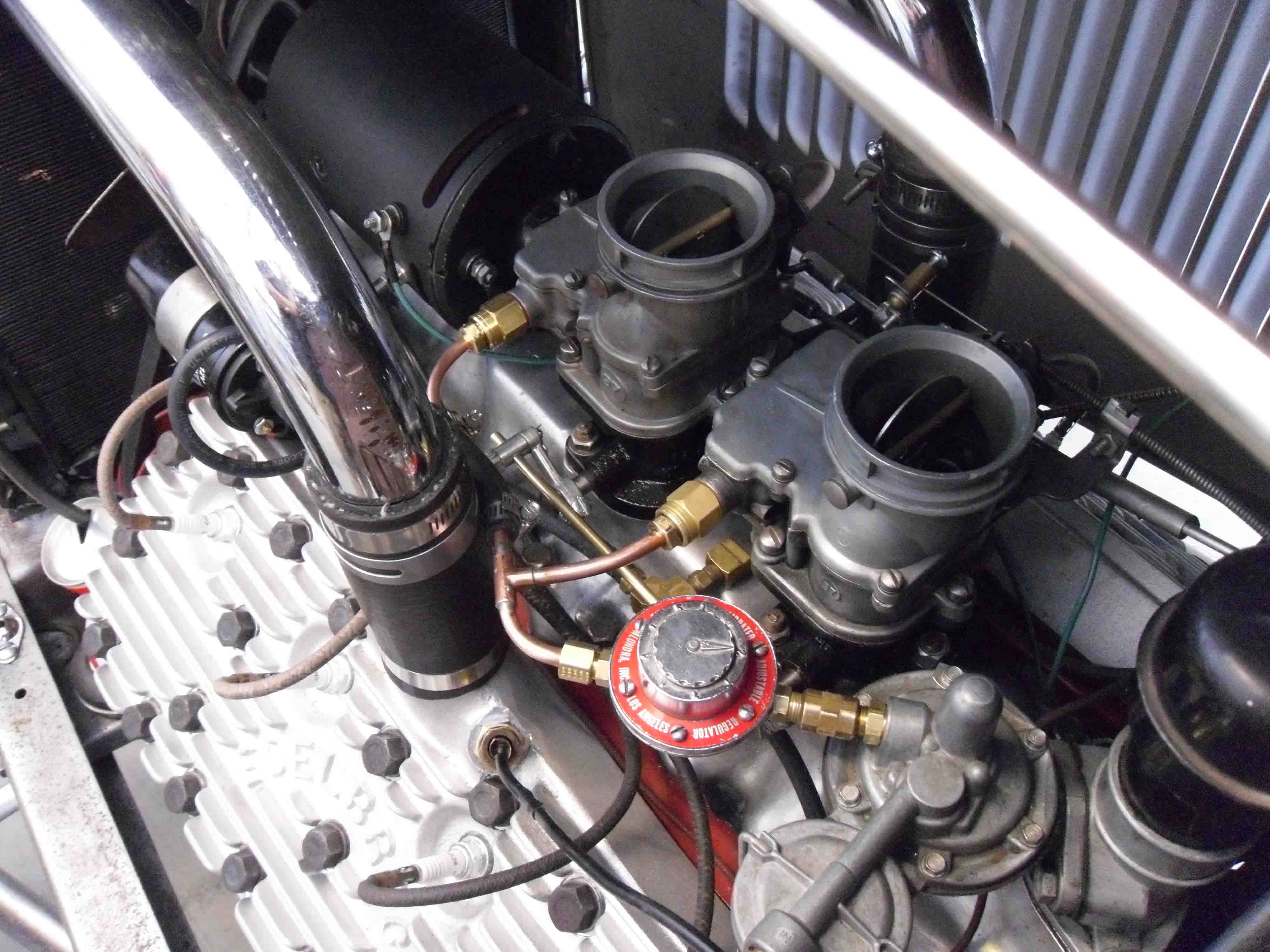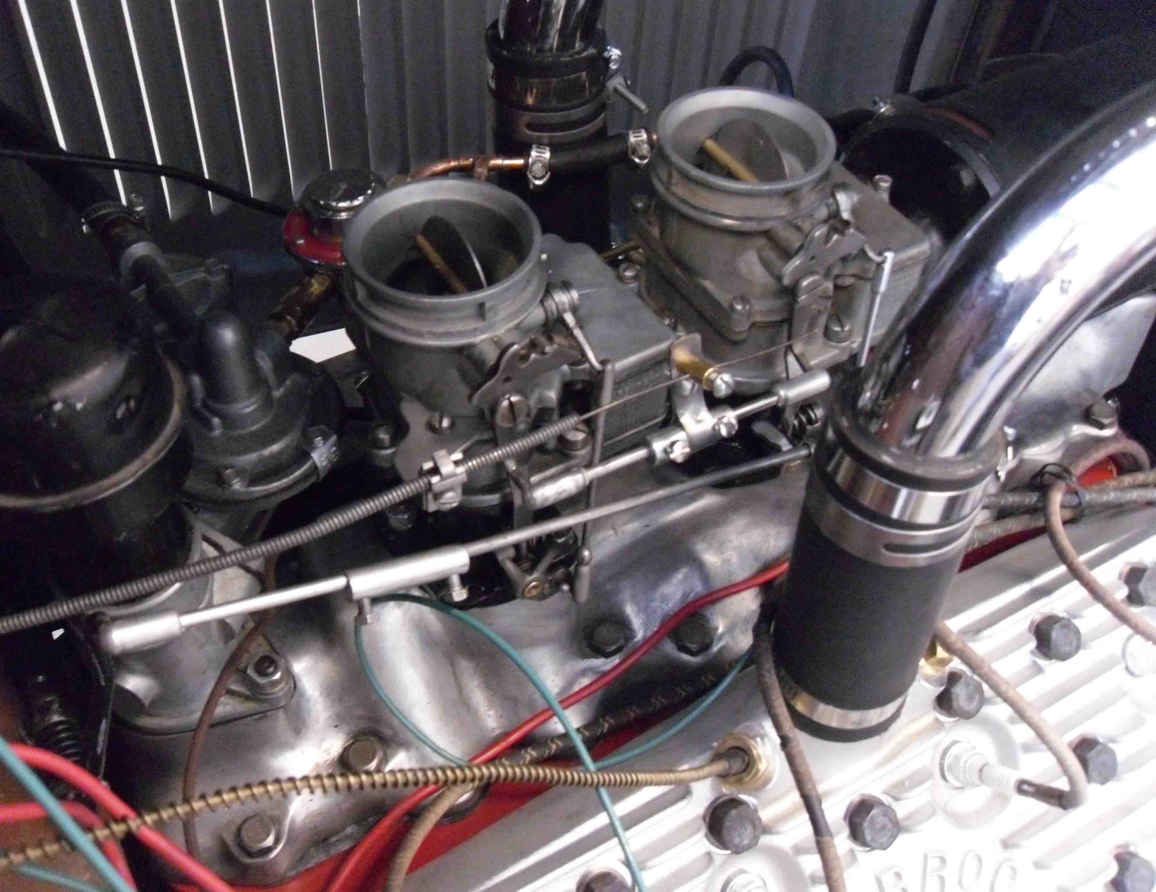 Those are dual 97's (not progressive)on an Edmunds intake. I used copper line and brass fittings with one little piece of hose for the fuel. I used a choke cable from a '49 Ford with a Holley 94 choke bracket modified to fit the 97 and adapted a brass cable stop to a small bracket on the choke linkage.