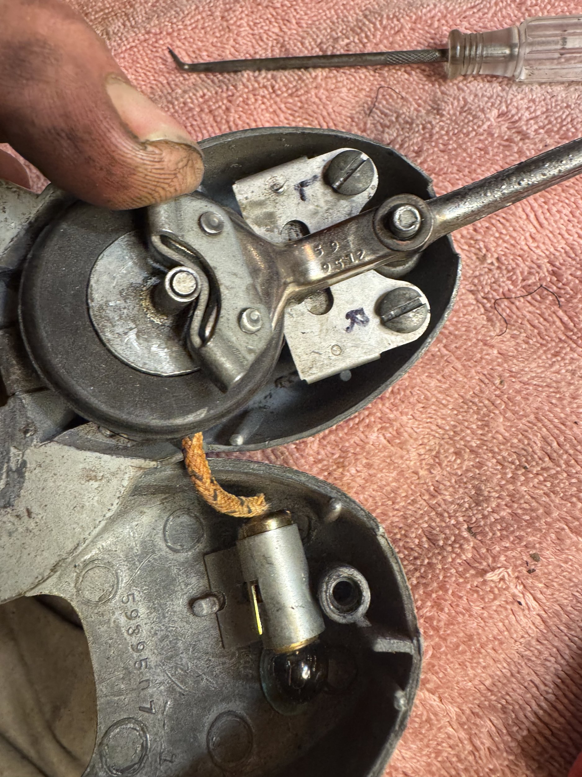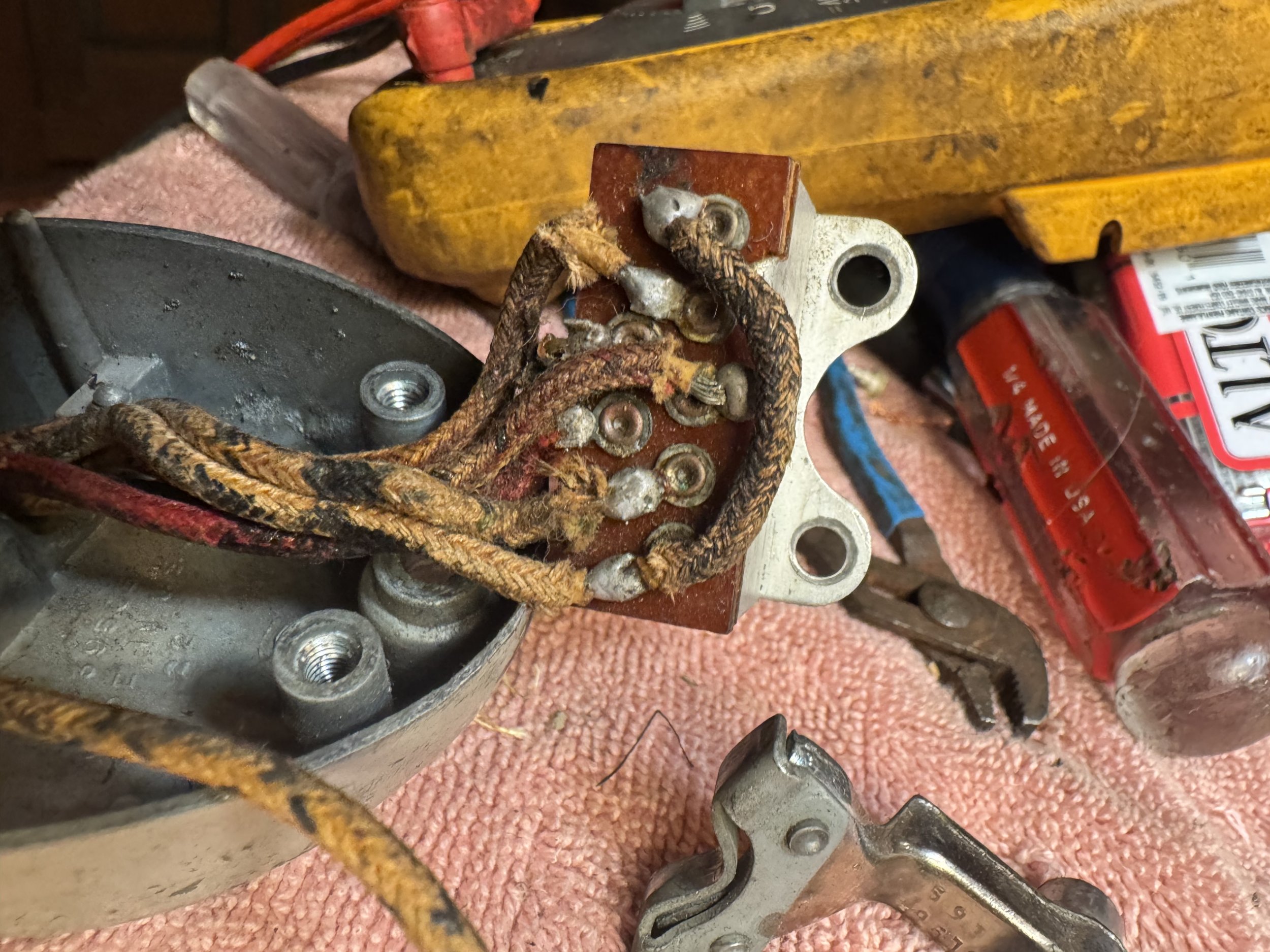 Okay, I got it to work! Now the little blue indicator light doesn’t flash but you gotta pick your goddamn battles, and I’ll take the win. Of course tonight at midnight when I go to get a glass of water, I’ll see it in the corner of my eye and next thing I know it’s dawn, I haven’t slept and my turn signal is now tossed in a pile in the corner of the kitchen and I’ve got a stromberg gutted before me. ADHD, it’s a bitch. Steve the thread you recommended was excellently written and exactly what I’d been searching for on Google for days. He even knew to write the numeral 3 when speaking of a specific wire and spell the number three when speaking of the number of wires… That being said, I got confused, in the first section of identifying the wires 1, 2 and 3. when my results kept contradicting my expectations. This too made me tear into the unit. And check for any bare wire contacts, clean the contacts, and see what was what in general. Hopefully this will help others not open their veins in a warm bath in the future. Here goes with pictures for us less intellectuals. Pic 1 is the Guide 6004 7 wire turn signal. Pic 2 the lid off exposing the mechanical lever actuator Pic 3 lever removed exposing the 7 wires going into the brains of the unit. Pic 4 the underside of the brains showing where each wire is soldered. When I looked at it I noticed the jumper wire. That’s the exact unit drawn in the schematic I’ve been following for a 52 Chevy turn signal I then labeled each wire as it’s drawn working backwards from the brain. And wired it as shown. The only bit that still causes confusion is. The indicator bulb in the schematic shows it leaving the flasher unit P terminal, and described as a black and green threaded wire. Yet it is actually tan and black. And there is no other wire to swap it with that will rectify the problem. Least none that I can think of.